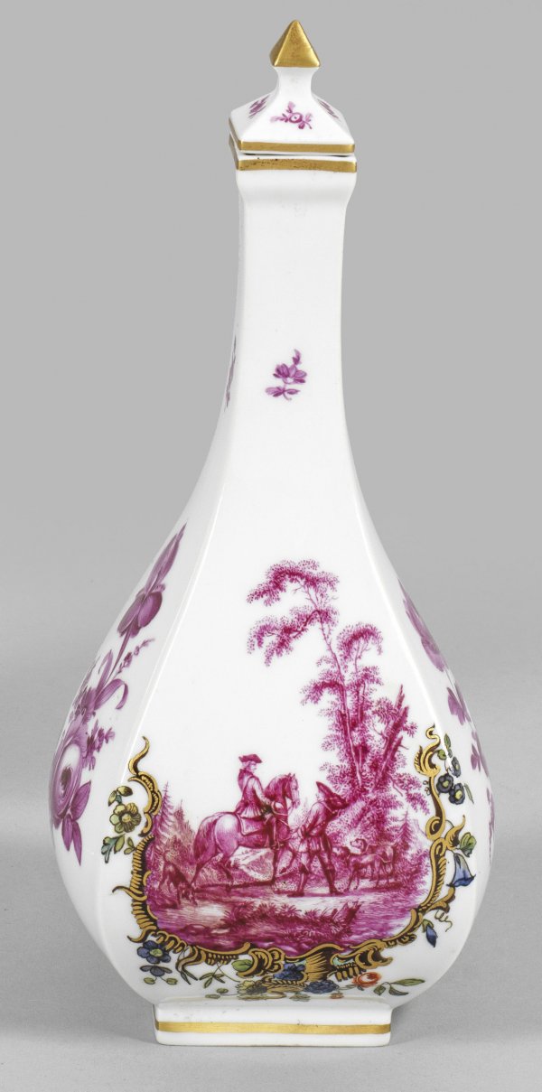 Vierkantige Balusterform mit schmalem Hals. Konischer Deckel; Pyramidenknauf. Schauseitig, von Goldrocaillen und Blumen gerahmte Darstellung von Jägern mit Hunden bzw. Hirsch und Rehen in bewaldeter Landschaft im Wechsel mit großen Blumengebinden. Purpurfarbene Camaieumalerei mit Goldstaffage. Manufakturmarke. H. 24,5 cm.