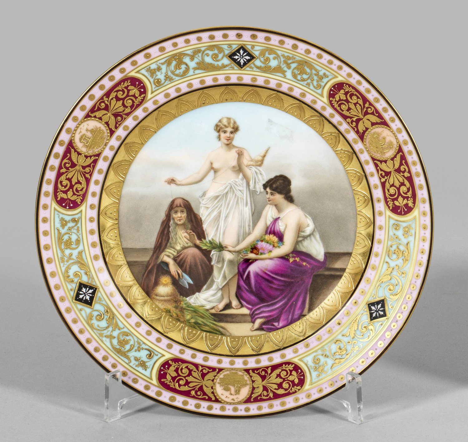 Runde Form. Im leicht vertieften, goldkonturierten Spiegel Darstellung der drei römischen Schicksalgöttinen in feiner polychromer Malerei. Auf der Fahne reicher Reliefgolddekor aus alternierenden Reservenfeldern mit Rankenwerk und Medaillon bzw. Raute auf verschiedenfarbigen Fonds. Manufakturmarke. D. 24 cm.