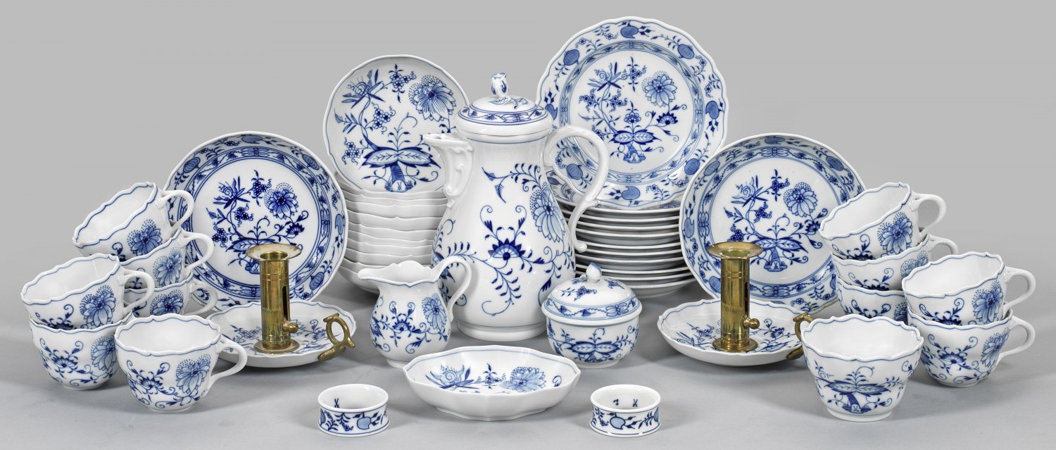 für 11 Personen. 33-tlg.; Kaffeekanne, Sahnegießer, Zuckerdose, 11 Kaffeetassen mit Untertassen, 11 Kuchenteller, 2 Gebäckschalen, Konfektschälchen, 2 Serviettenringe, 2 Kerzenhalter mit Messingmontur. Zwiebelmusterdekor in unterglasurblauer Malerei. Beigabe: weitere Kaffeetasse. Teilw. minim. best. Schwertermarke. Kannen-H. 28 cm.