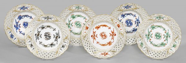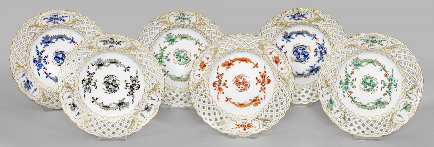 Six open-worked porcelain plates with decor "Rich dragon". Crossed swords mark.