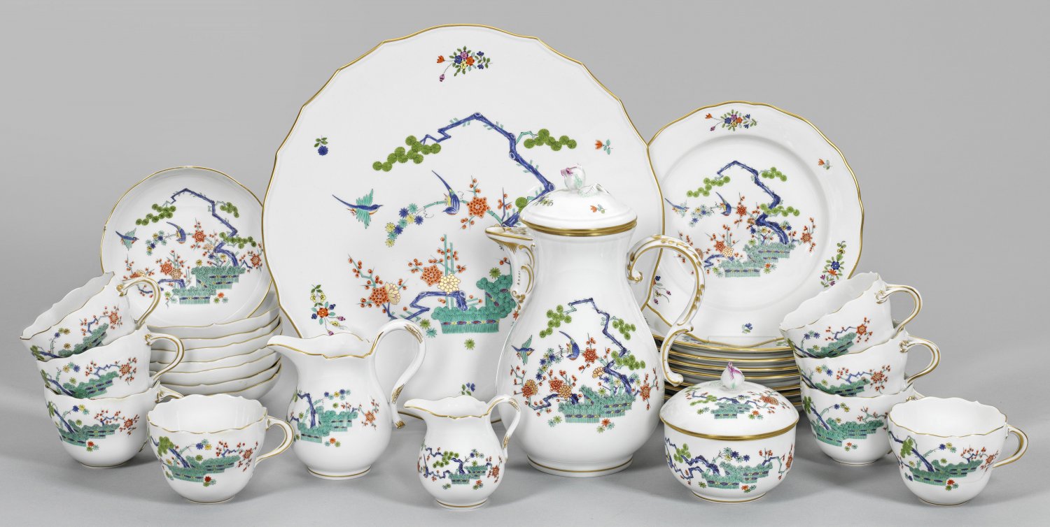 für 8 Personen. 21-tlg.; Kaffee-, Milchkanne, Sahnegießer, Zuckerdose, 8 Kaffeetassen mit Untertassen, 8 Kuchenteller, Kuchenplatte. Feiner Dekor nach ostasiatischen Vorbildern, sog. "Drei Freunde" mit Prunus, Bambus und Pinie (bzw. "Indisches Astmuster"). Polychrome Malerei im Kakiemonstil mit Goldrand. Teilw. best. mit Haarriss. Schwertermarke. Kannen-H. 24 cm. Platte D. 32 cm.
