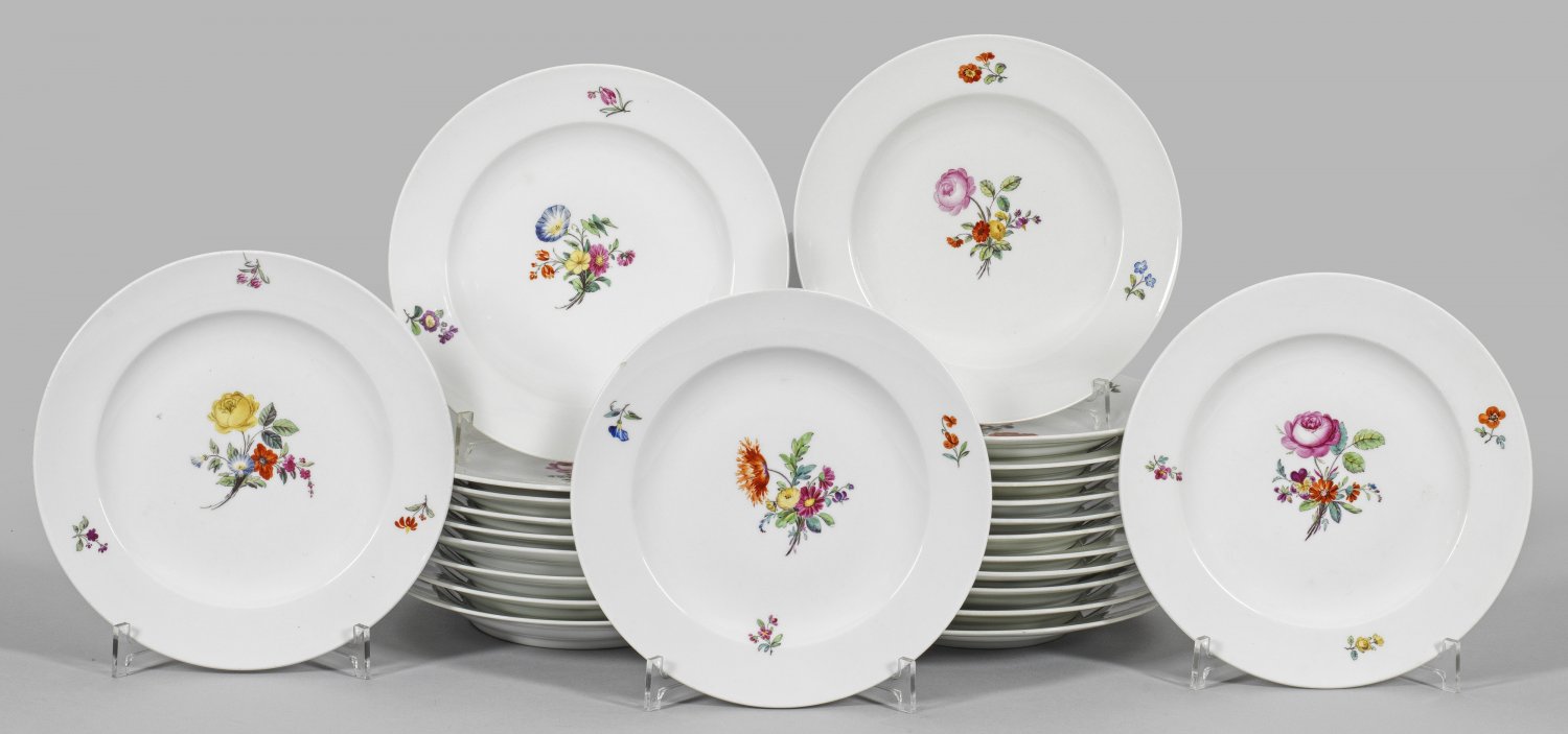 Twentyfour porcelain plates with floral decor. Partly insignificantly chipped. Sceptre and partly painter's mark.