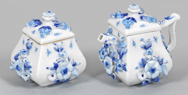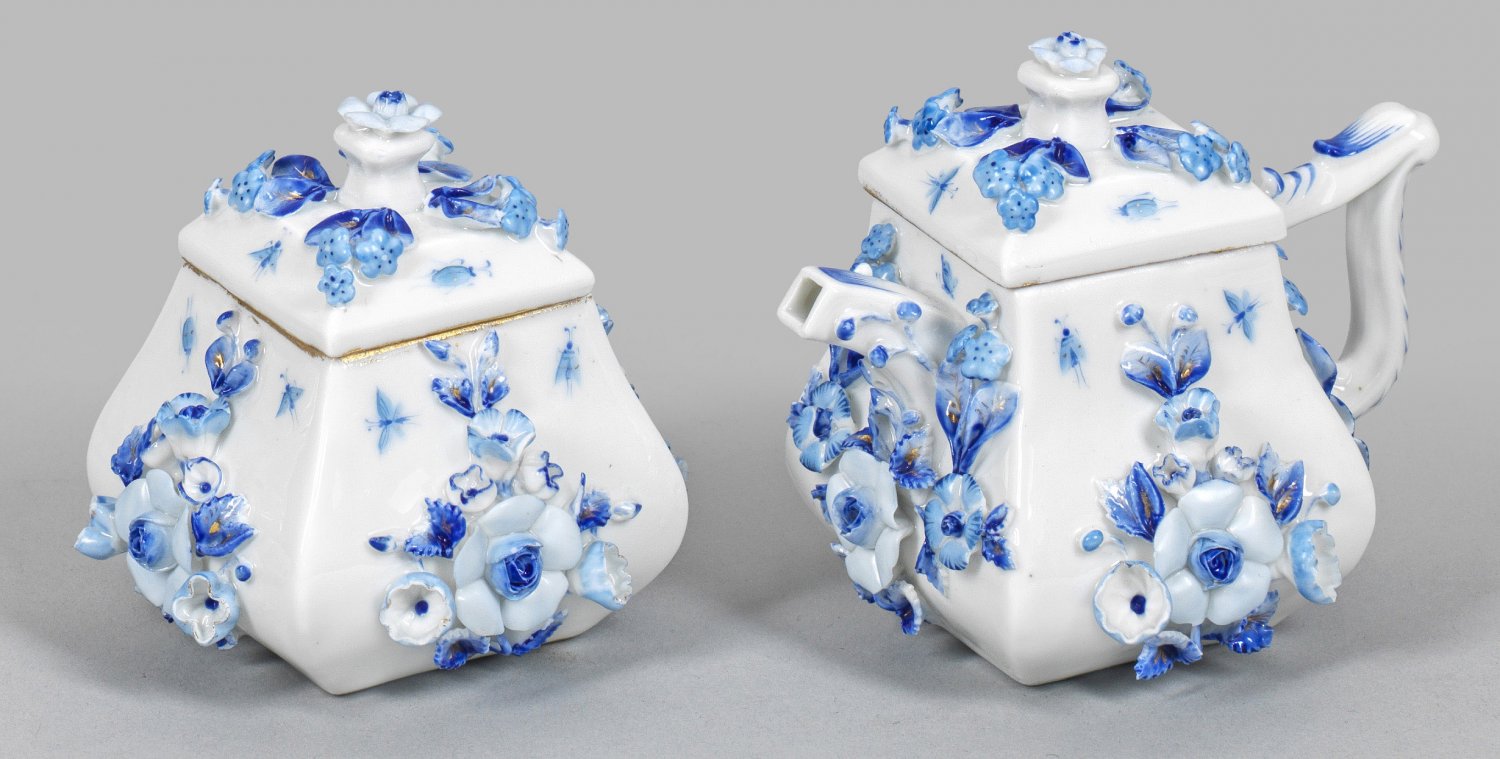 3-tlg.; Gedrückter, balusterförmiger, vierkantiger Korpus mit gehöhtem Deckel. Allseitig feinplastisch aufgelegte, blau staffierte Blumen und Blütenzweige, umgeben von Insektendekor in Camaieumalerei mit dezenter Goldstaffage. Minim. best.; Manufakturmarke. Kannen-H. 9 cm