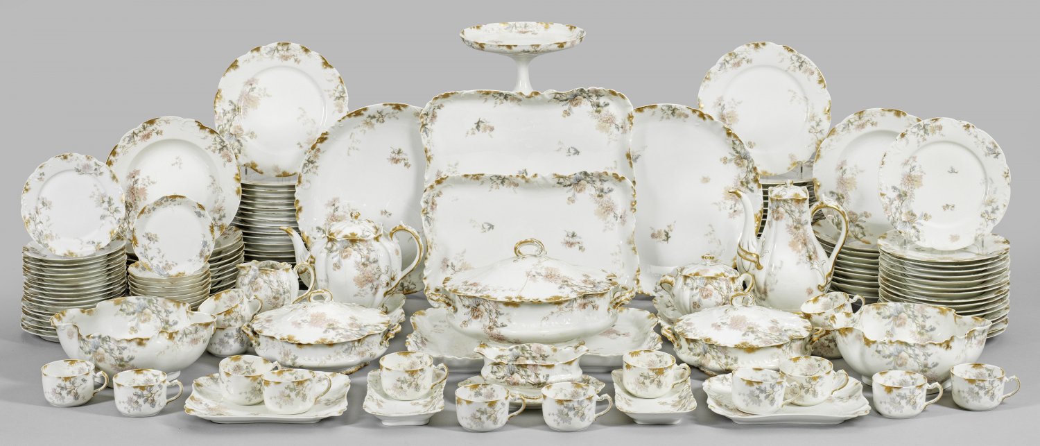für 14 Personen. 124-tlg.: Kaffee-, Teekanne, Zuckerdose, Sahnegießer, 14 Kaffeetassen mit Untertassen, 36 Speise-, 19 Suppen-, 16 Kuchen-, 18 Dessertteller, Deckelterrine und 2 Gemüseterrinen, 7 Anbietplatten, Sauciere, 6 Anbietschalen, Gebäck-Fußschale. Dezentes Rocaillerelief. Floraler Dekor aus feinen Chrysanthemenzweigen, sog. "Schleiger 86"-Muster, in pastelltoniger Malerei. Goldstaffage. Beigabe: 2 korrespondierende Kaffeetassen. Teilw. rep./best./Haarriss. Manufakturmarke. Plattenmaße 24 cm - 39 cm x 20 cm - 26 cm. Platten-D. 34 cm. Fußschalen-H. 14 cm.