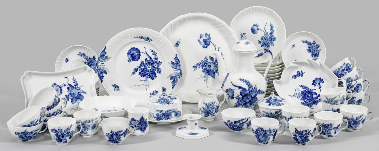 Kaffeekanne, Sahnegießer, Zuckerdose, 12 Kaffee-, 6 Teetassen mit Untertassen, 11 Frühstücksteller, Butterdose, 2 Anbietplatten, 2 kleine Beilagenschalen, kleines Tablett, Kerzenhalter, Vase. Reliefdekor "Neuozier". Dekor "Blaue Blume" in unterglasurblauer Malerei. Beigabe: 2 korrespondierende Tassen. Manufakturmarke. Platten-D. 25,5 cm - 29,5 cm.