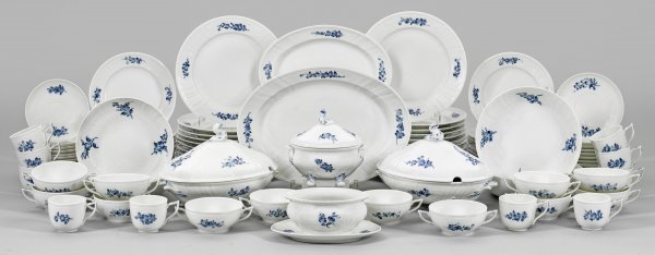 23 Speise-, 18 Kuchenteller, 10 Kaffee-, 12 Suppentassen mit Untertassen, 2 Terrinen, 2 Anbietplatten, 4 Beilagenschalen, Sauciere, Zuckerdose. Teilw. gerippte Wandung. In reliefierten Rocaillekartuschen gerahmte Blütenzweige in unterglasurblauer Malerei. Manufakturmarke. Terrinen-H. 18,5 cm. 29 cm x 19 cm. Platte 38,5 cm x 27,5 cm.