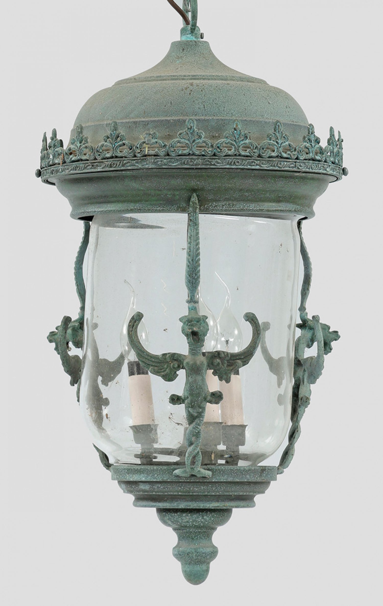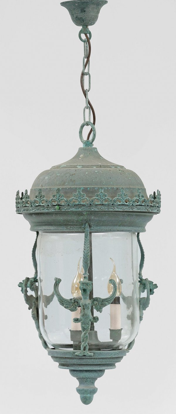 3-flg.; Metall, graugrün patiniert. Balusterförmiger Korpus mit kuppelförmigem oberen Abschluss sowie durchbrochen gearbeitete Galerierahmung, flankiert von vollplastisch gestalteten Greifen. In der Mitte schlanker Schaft als Träger für Leuchtmittel. Dazu kurze Kettenaufhängung. Elektrifiziert. Lampen-H. 64 cm. D. 32 cm.