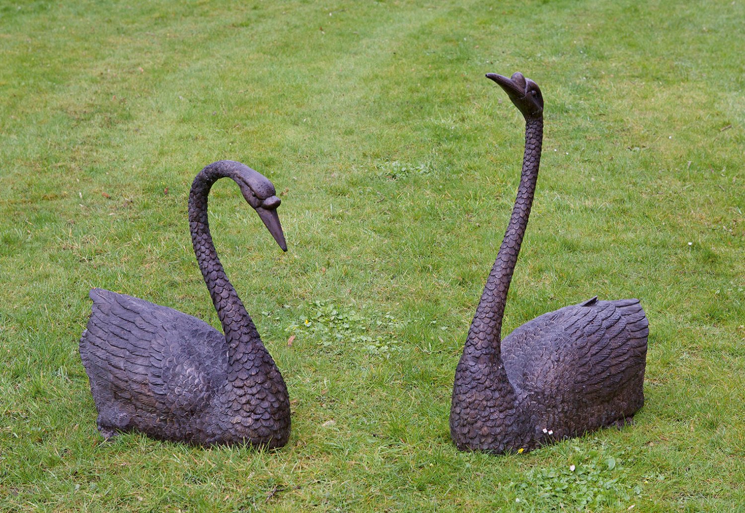Gegenstücke. Bronze, dunkelbraun patiniert. Vollplastische, annähernd lebensgroße, naturgetreue, lebendige Darstellungen zweier schwimmender Schwäne mit gesenktem bzw. hoch erhobenem Kopf. Detailreich modellierte Federzeichnung. H. ca. 69 cm-90 cm.