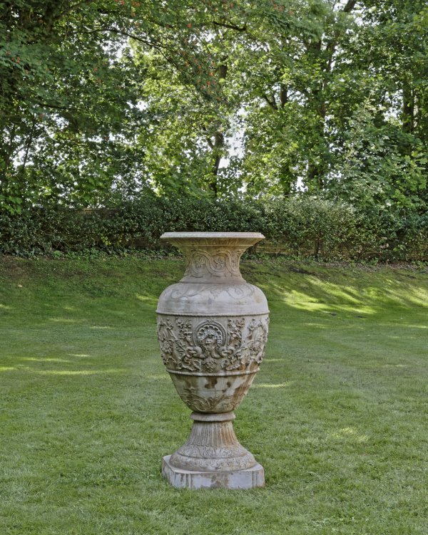 Gusseisen, cremefarben lackiert. Balusterförmiger Korpus mit ausschwingendem, profiliertem Lippenrand auf leicht konischem Sockel. Umlaufend der Wandung breiter Fries aus üppigen, eingerollten Blattvoluten und erhaben reliefierten Neirieden. H. 130 cm.