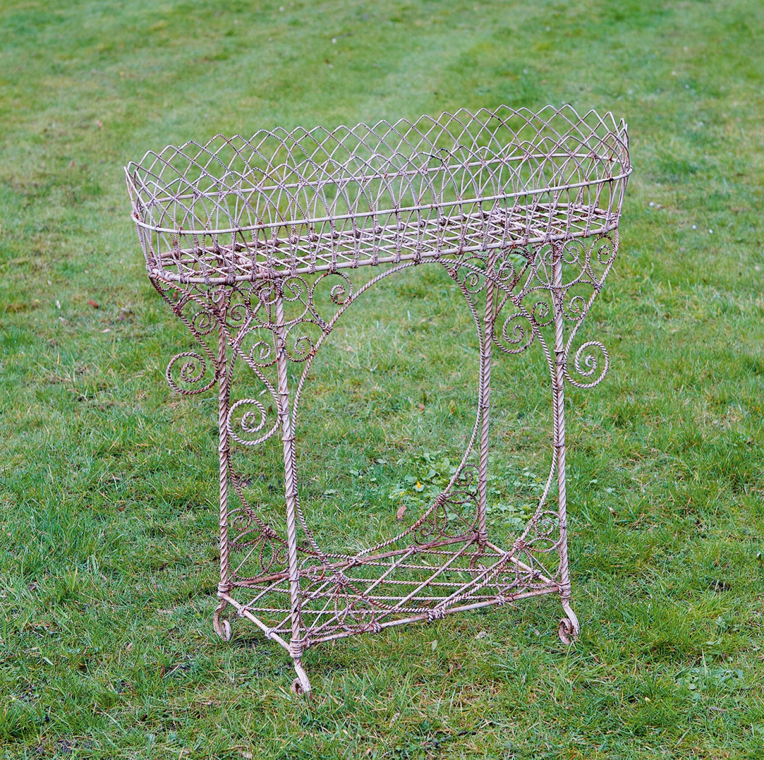 Metall, cremefarben lackiert. Offen gestaltetes Gestell aus gedrehten, volutenförmig eingerollten und ornamental angelegten Rundstäben als Träger für korbähnliche Blumenjardiniere. H. 87,5 cm. 88 cm x 26 cm.