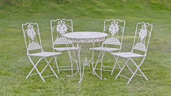 5-tlg.; Tisch und vier Stühle. Metall, cremefarben lackiert. Gitterartig durchbrochen, runde Deckplatte auf geschwungenen Beinen. Korrespondierende faltbare Stühle mit Herzmotiv in der Rückenlehne. Tisch-H. 74 cm. D. 68 cm. Sitz-H. 45 cm.