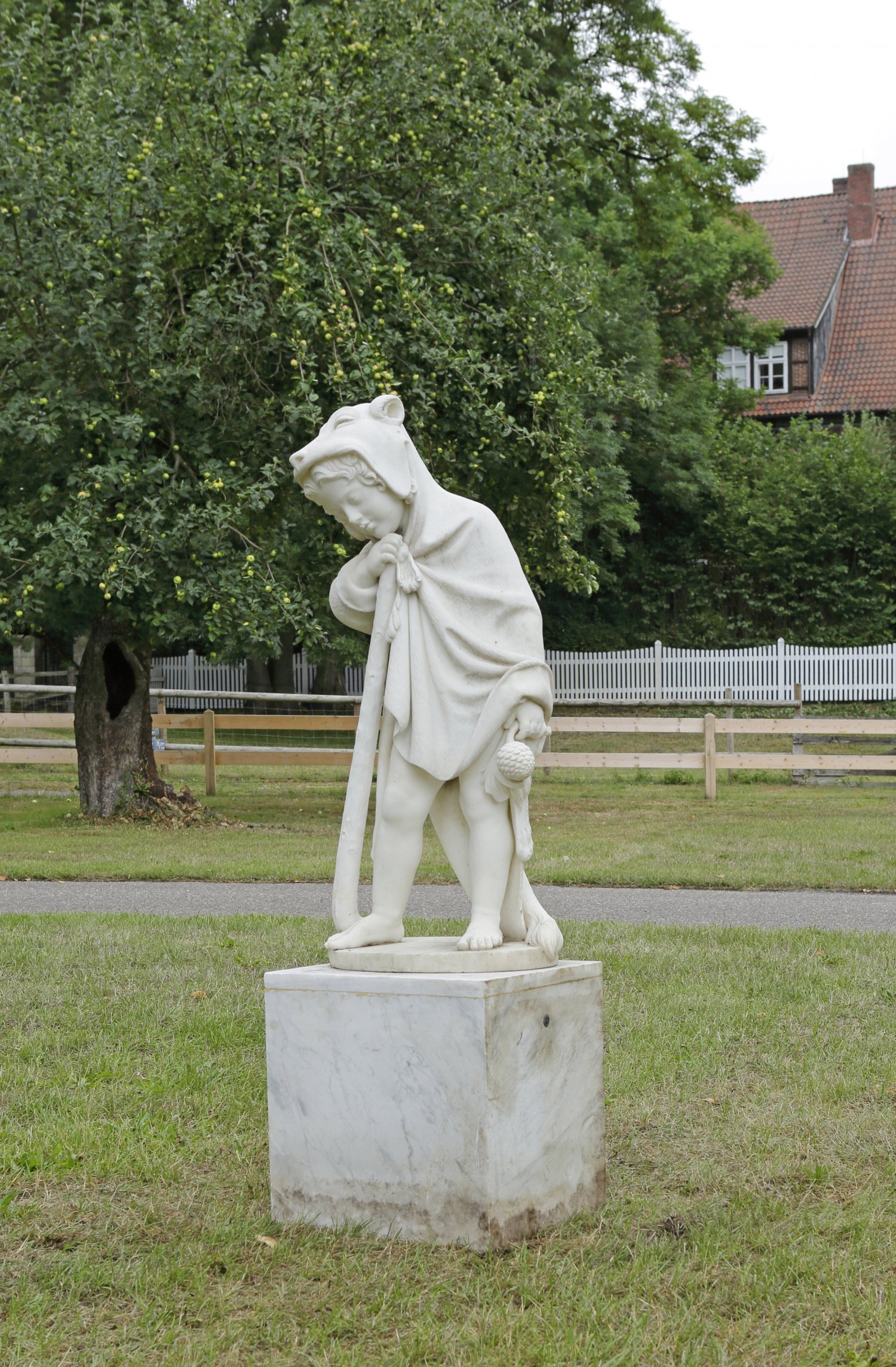 Weißer Carrara-Marmor. Sign. u. dat. 1848 mit Ortsangabe Rom. Vollplastische, bildhauerisch subtil ausgeführte Darstellung des antiken Götterhelden als in ein Löwenfell gewandeter Knabe, auf einer ovalen Plinthe stehend und sich auf eine Keule stützend, in der linken Hand einen Pinienzapfen haltend. Wolff zählt zu den bedeutendsten deutschen Bildhauern des 19. Jhs. Er studierte ab 1815 an der Kunstakademie in Berlin und ab 1818 bei seinem Onkel Johann Gottfried Schadow. 1822 ging er nach Rom, wo er fortan blieb, aber zu Berlin weiterhin in Verbindung blieb. 1832 wurde er Mitglied der Preußischen Akademie der Künste. Stilistisch und in seinen Themen schloss sich Wolff der klassizistischen Richtung Thorvaldsens an und widmete sich vornehmlich antiken bzw. mythologischen Motiven. Zu den mit dieser Skulptur vergleichbaren Werken gehört seine 1836 geschaffene Statue des Eros, der sich ebenfalls in ein Löwenfell gewandet hat und auf eine Keule stützt. Späterer, kubischer Marmorsockel. Skulpturen-H. 97 cm; Sockel-H. 45 m.