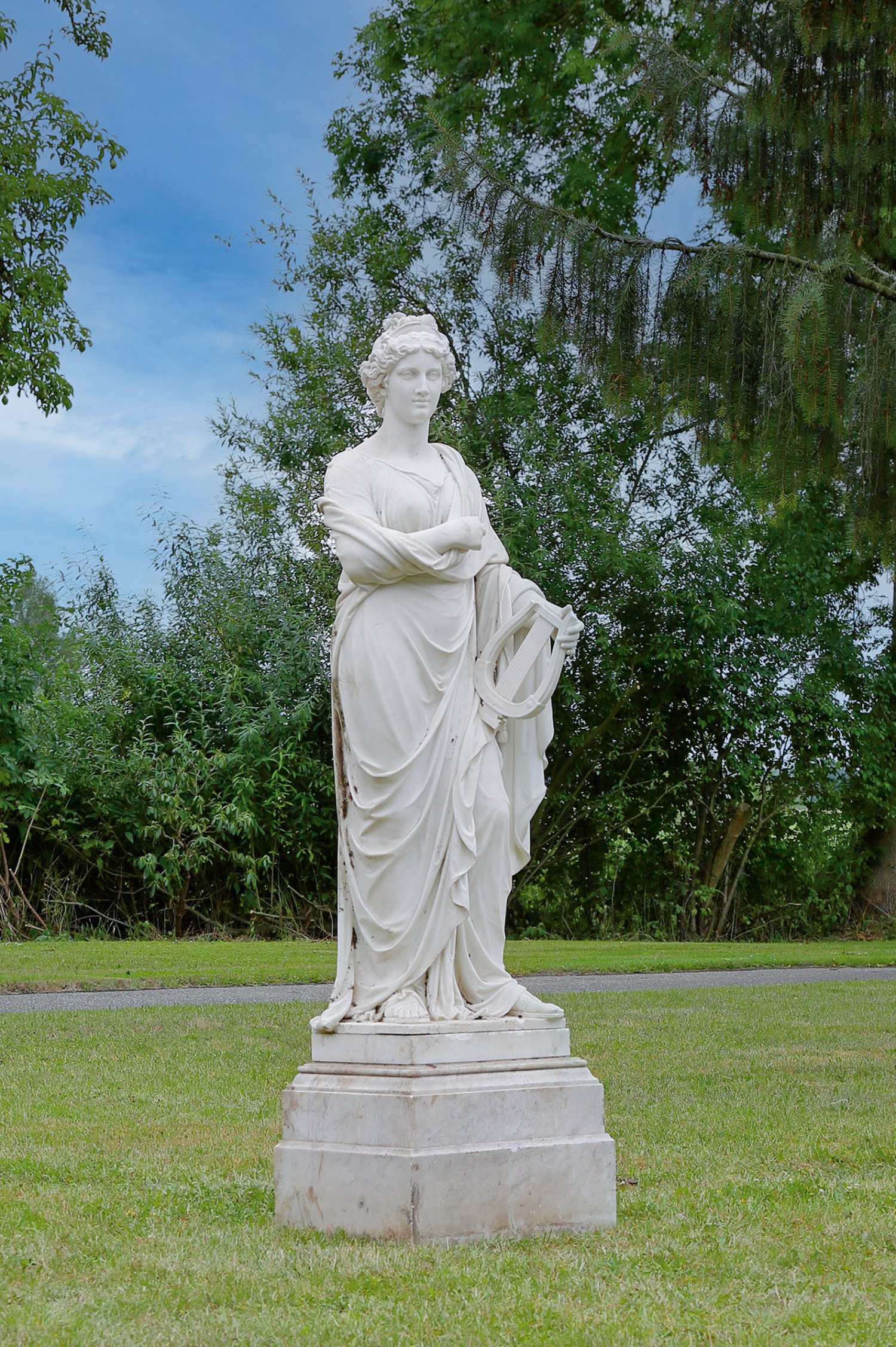 Weißer Carrara-Marmor. Sign. u dat. 1900 mit Ortsangabe Rom. Große, bildhauerisch subtil ausgeführte, vollplastische, neoklassizistische Darstellung der Erato, Diese hält eine Lyra bzw. Kythara in der Hand, als Attribute der griechischen Muse der Liebesdichtung der Lyrik, des Gesanges und des Tanzes. Dausch studierte an der Kunstakademie in München und erhielt 1868 ein Reisestipendium, mit dem er nach Rom zog und dort ab 1873 zusammen mit Peter Feile eine eigene Werkstatt im ehemaligen Atelier von Antonio Canova einrichtete. Stilistisch von Canova und Bertel Thorvaldsen beeinflusst, arbeitete Dausch überwiegend in Carrara-Marmor und blieb in Rom ansässig. 1873 zeigte er seine Figurengruppe "Simson und Delila" auf der Weltausstellung in Wien. Anschließend schuf er eine große Anzahl Skulpturen mit allegorischen oder mythologischen Themen. Eine Reihe von Freiskulpturen schuf er für Bremen, darunter die 1877/78 entstandene, vergleichbare Statue der "Musica" (ursprünglich in Knoops Park, heute im Bürgerpark in Bremen). Besch.; H. ca. 164 cm; Sockel-H. ca. 45,5 cm.