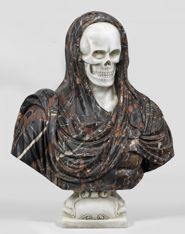 Weißer und rot-schwarz-weiß geäderter Marmor. Große vollplastisch gearbeitete Büste in der Tradition des Barock, bei der ein langes Tuch den Oberkörper und den leicht nach links in Viertelprofil gewandten Kopf umhüllt. Das frei gelassene Gesicht zeigt einen zwischen Leben und Tod stehenden, teilw. skelettierten Schädel, welcher mit einem breiten Grinsen die Menschen verlacht. Die gegliederte Säulenbasis mit schauseitiger, volutierter Reliefkartusche. Ger. best.; H. 69 cm.
