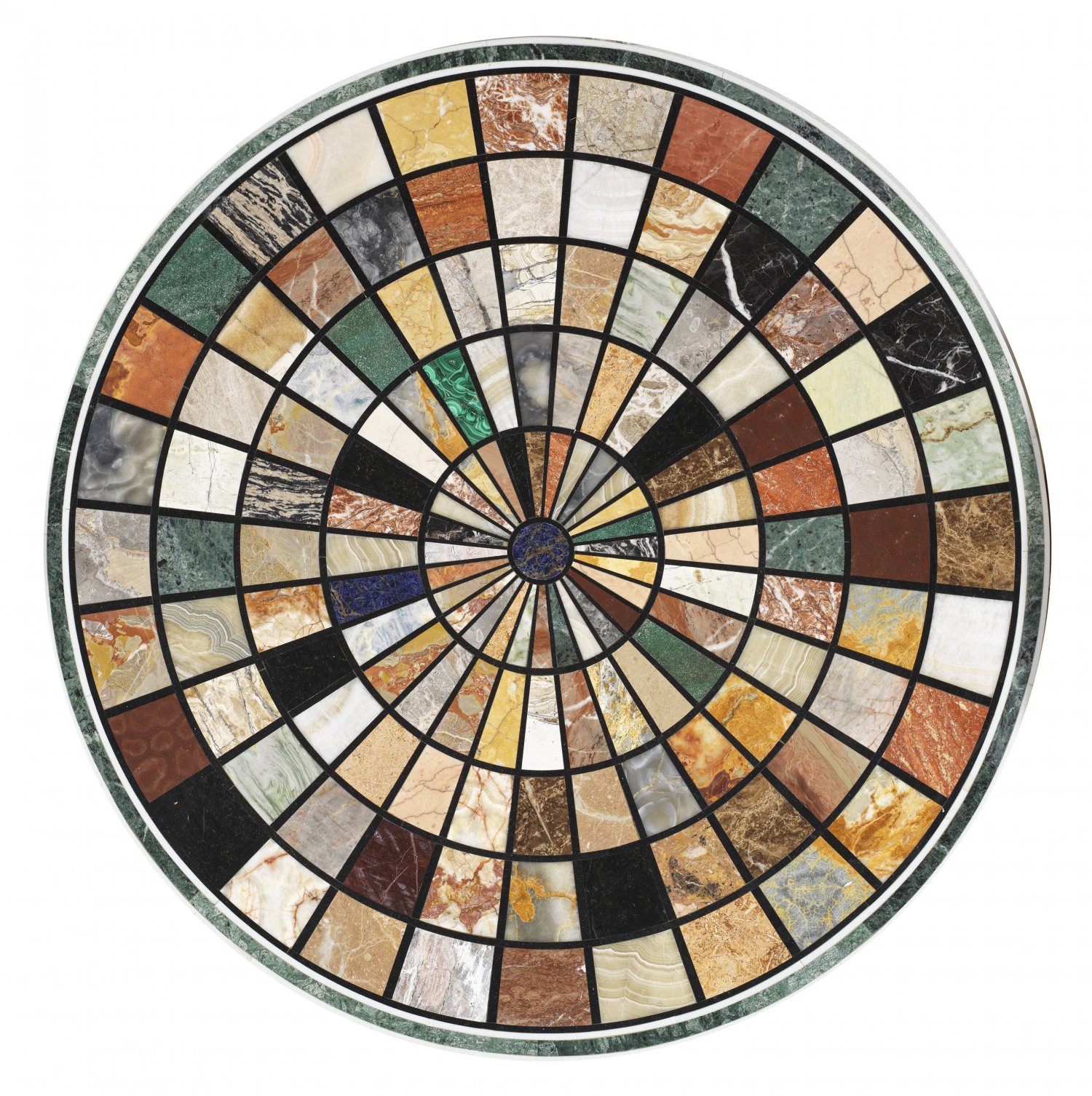 Unterschiedlich gemaserter Marmor in Beige-, Braun-, Grün- und Grautönen sowie Malachit, Lapislazuli und Onyx. Flächendeckender Dekor aus mosaikartig angeordneten Reserven und schmalen Bändern mit zentriertem Tondo. D. 91 cm.