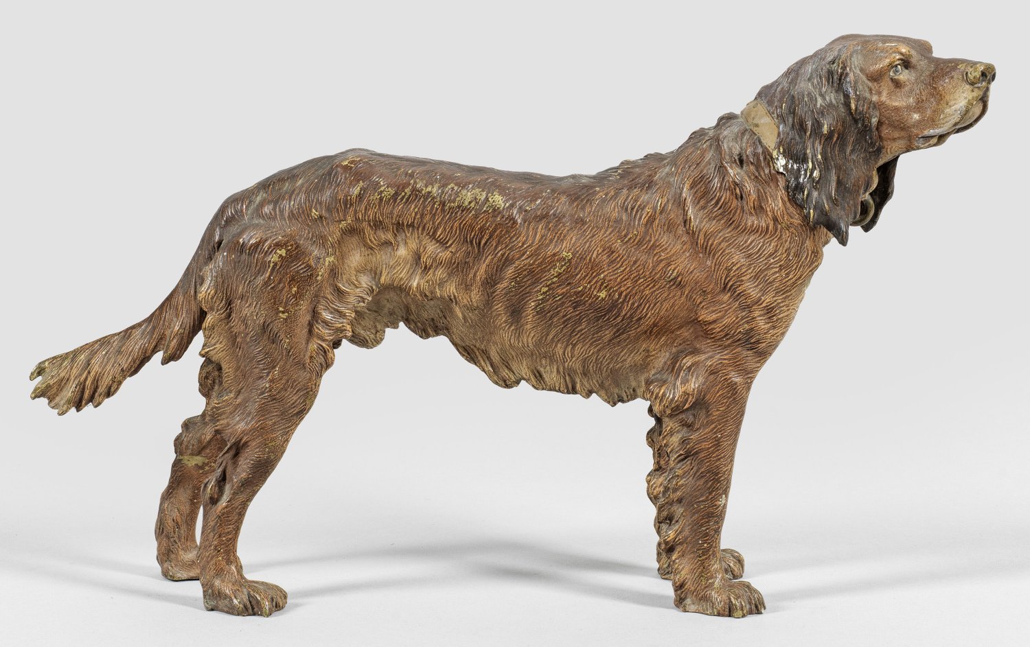 Ziseliert und farbig bemalt. Vollplastische, detailreiche, naturgetreue Darstellung eines stehenden Jagdhundes mit leicht nach rechts gewandtem, erhobenem Kopf. Firmen-Krugmarke mit eingestelltem "B". H. 21,5 cm.