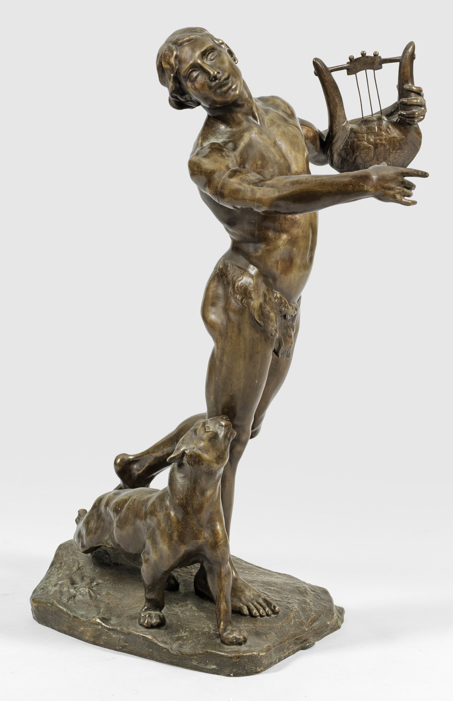 Bronze, dunkelbraun patiniert, um 1909. Sign. Große Figurengruppe mit Motiv aus der griechischen Mythologie. Auf einer unregelmäßigen Plinthe schreitender Orpheus als Halbakt in bewegter Sänger-Pose, neben ihm ein zu ihm aufschauender Panther. Der aus einer Bildhauerfamilie stammende Künstler studierte an der Akademie von Antwerpen, 1906 und 1909 nahm er am Wettbewerb zum "Prix de Rome" teil, 1910 an der Weltausstellung in Brüssel. H. 85 cm.