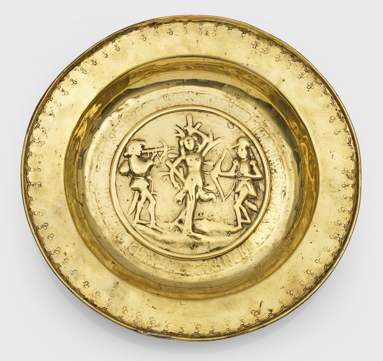 Messing, getrieben, minim. gewölbter Spiegel mit Darstellung des Martyriums des Heiligen Sebastian. Gerahmt von umlaufendem Band mit unleserlicher Inschrift. Hoch aufsteigende Fahne, verziert mit Wellenband und stilisierten Blütenkelchen. Rest., minim. besch.; D. 37,5 cm.