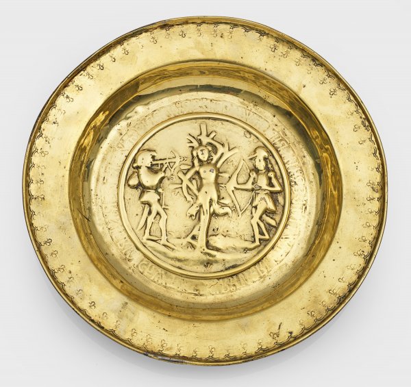 A South German brass alms dish. Restored, minor damaged.