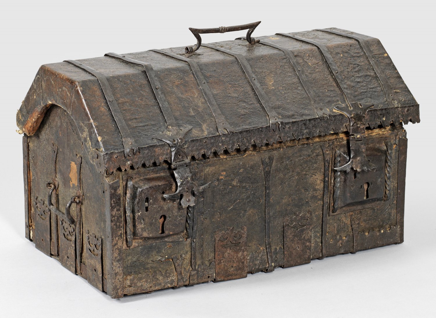 Holz, geprägtes Leder und Eisen. Rechteckiger Korpus mit Holzkern, flächendeckend bezogen mit dunkelbraunem, ornamental in Form von Voluten und Blüten geprägtem Leder und mit vernieteten Bandbeschlägen verziert. Die Ecken und Kanten umzogen von teilw. durchbrochen gearbeiteten Beschlägen. Aufgewölbter, gekanteter Scharnierdeckel mit zwei Überfallriegeln. Schauseitig rechts und links je ein Schloss. Seitlich sowie auf dem Deckel mit beweglichen Tragegriffen. Schlüssel nicht vorhanden. Altersgemäßer Gebrauchszustand. H. 33 cm. 57 cm x 32,5 cm.