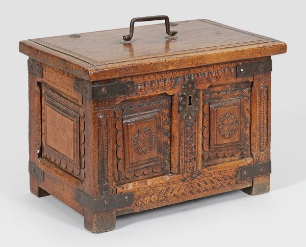 Nussbaum, teilw. geschnitzt. Gerader, querrechteckig angelegter Korpus, flankiert von gekanteten Pfosten, umspannt von gekanteten Eisenbeschlägen. Allseitig profilierte Kassettenfüllungen, in der Front mit Rosetten aus Kerbschnitzerei. Rechteckiger Flachdeckel mit gekantetem Griff. H. 31 cm. 45 cm x 27 cm.