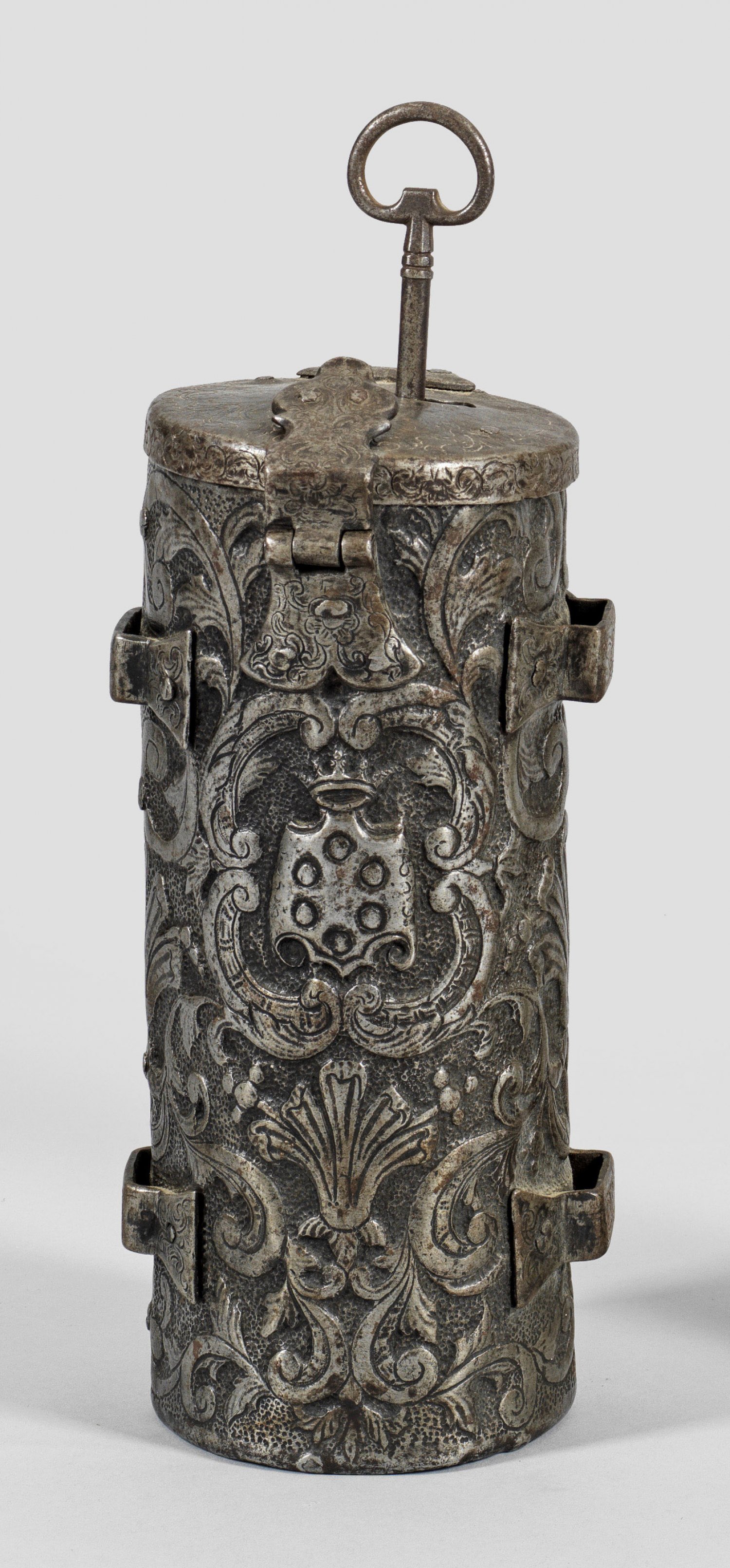 Zylindrischer Korpus. Schauseitig bekröntes Wappen in Rocaillenkartusche mit sechs symmetrisch angeordneten Kugeln, welches an das Wappen der Familie Medici erinnert. Auf der Rückseite reliefplastischer Maskaron. Die Wandung umlaufend verziert mit flächendeckendem Blattranken- und Volutendekor über punziertem Grund. Seitlich je zwei kantige, aufgenietete und floral ziselierte Ösen für Tragegurt. Scharnierter, korrespondierend ziselierter Deckel mit Überfallriegel und Schloss im Inneren. Schlüssel vorhanden. Altersbedingte Gebrauchsspuren. H. 26 cm. D. 10,5 cm.
