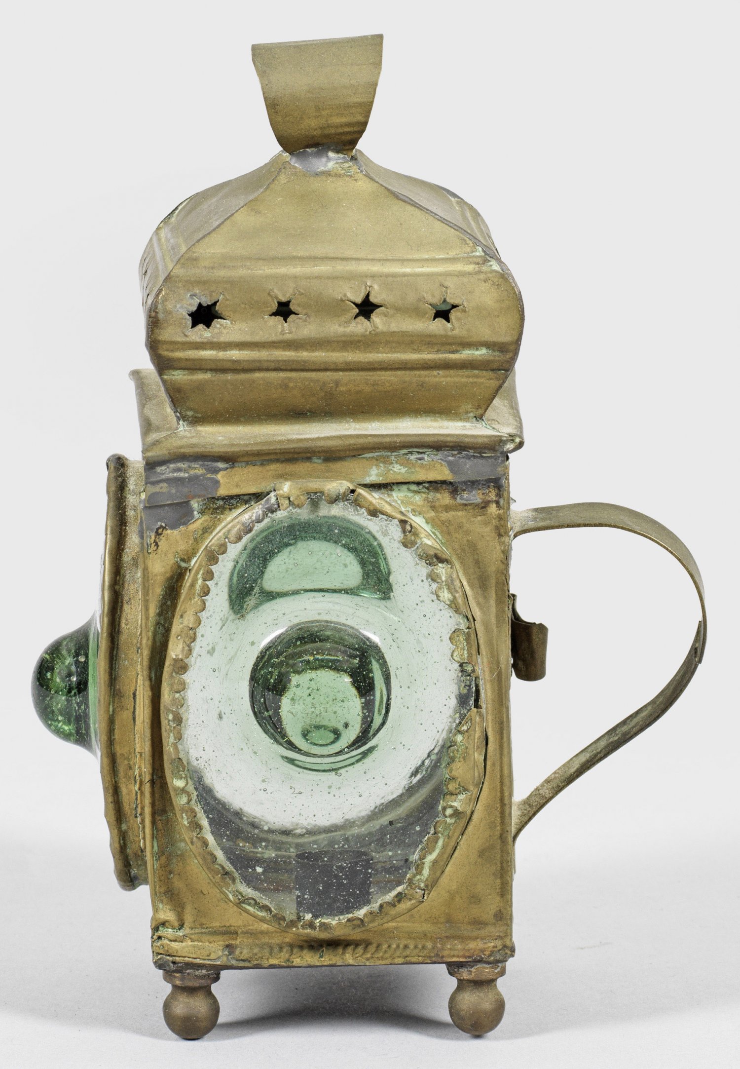 Messing, geprägt und grünes Glas. Hochrechteckiger Korpus mit haubenartigem, in Form von Sternen durchbrochen gearbeitetem Abschluss. Dreiseitig verglast. Rückseitig Bandhenkel. Teilw. besch., rep.; H. 20,5 cm.