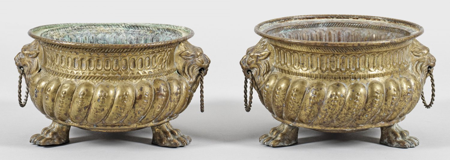 Messing. Über drei stilisierten Tatzenfüßen bauchiger, umlaufend godronierter Korpus mit ausschwingendem Rand. Seitlich zwei Löwenköpfe mit beweglicher Ringhalterung im Maul. Gebrauchsspuren. H. 16 cm. D. 24,5 cm.