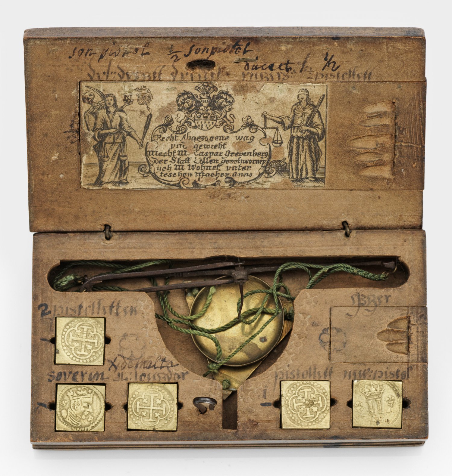 Messing, Eisen. In Original-Holzkästchen mit verriegelbarem Scharnierdeckel. Die Deckeloberseite mit geprägtem Sterne- und Lineardekor verziert. Im Inneren Fachunterteilungen mit kleiner Handwaage sowie 13 quadratischen Messinggewichten. Eisenwaage mit runder sowie dreieckiger Gewichtschale in Messing an dunkelgrüner Kordel. Im Deckelinneren Schubfach mit eingelassenen Gewichten. Darüber eine Etikette mit feinem Kupferstich. U. a. dargestellt das Wappen von Grevenberg, Justitia mit Waage und Schwert sowie der Tod mit Stundenglas. Zentral die Inschrift: "Recht abgezogene Wag, und gewicht, macht M: Caspar Grevenberg, der Statt Cöllen geschworener, ych M Wohnet unter, teschen Macher anno". Teilw. handschriftliche Vermerke. Drei Kleinstgewichte in weiterem Schubfach. Gem. Meister Caspar Grevenberg (wird Meister 1703). Altersbedingte Gebrauchsspuren. H. 3 cm. 12,5 cm x 7 cm.