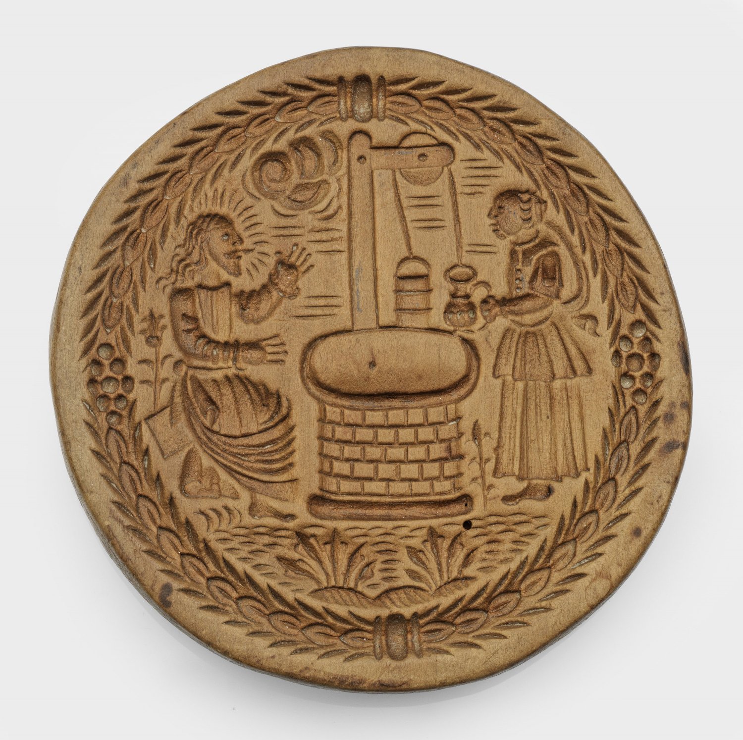 Birnenholz geschnitzt. Rundes Model. Dargestellt die Begegnung von Jesus und der Samariterin am Jakobsbrunnen, umgeben von stilisiertem Lorbeerkranz. Rückseitig mit geschnitzten Initialen "H K H", sowie handschriftlicher Widmungsinschrift. D. 12 cm.