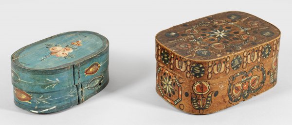 Two Alpine or South German colourful painted chipboard boxes. Age-related signs of use.