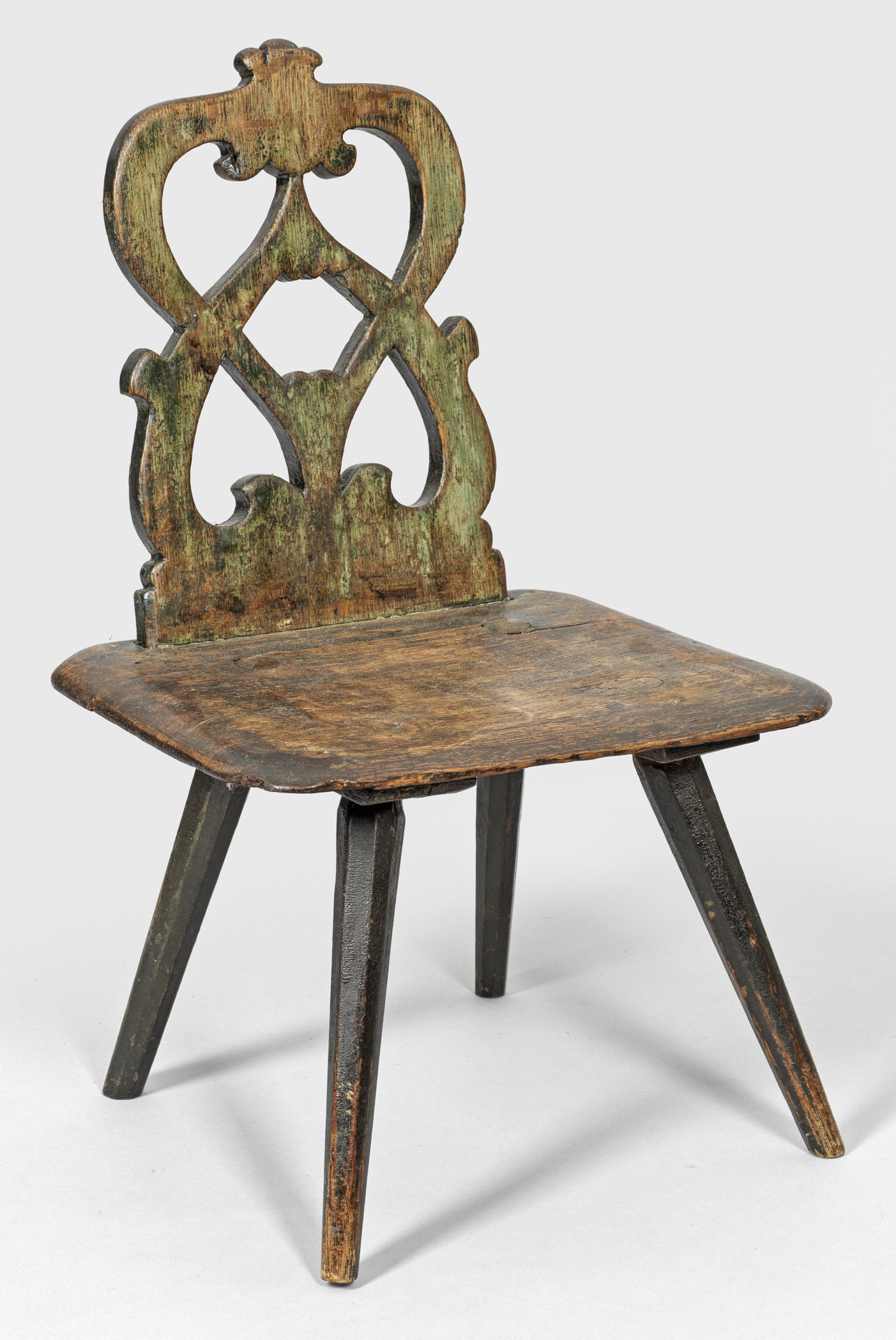Holz mit Resten dunkelbrauner bzw. hellgrüner Fassung. Flache Sitzfläche auf schräggestellten, gekanteten Beinen. Durchbrochen gearbeitete Rückenlehne aus gegeneinandergestellten Herzmotiven. H. 51,5 cm.