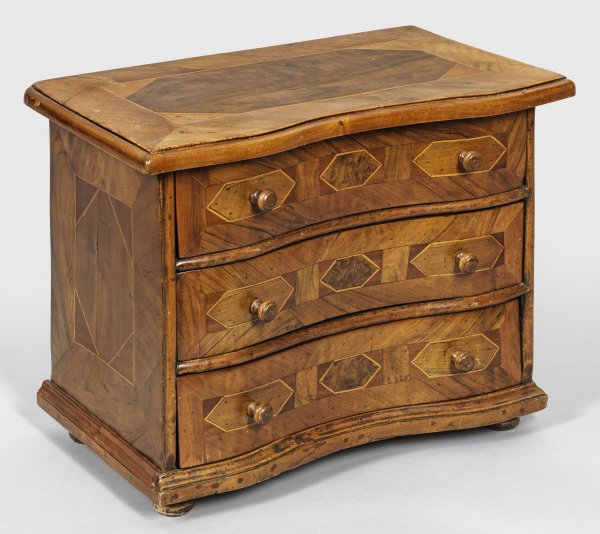 A large South German walnut veneered Baroque model chest of drawers.