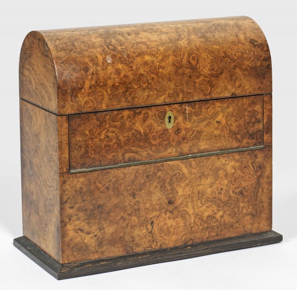 Wurzelnuss, furniert. Querrechteckig angelegter Korpus auf schmaler Zarge. Hochgewölbter Runddeckel sowie teilw. abklappbare Front. Innen Aussparungen für drei Flaschen mit violetter Samtauskleidung. Schloss bez. "Patent Lever". Ohne Schlüssel und Flaschen. H. 32 cm. 35,5 cm x 16 cm.