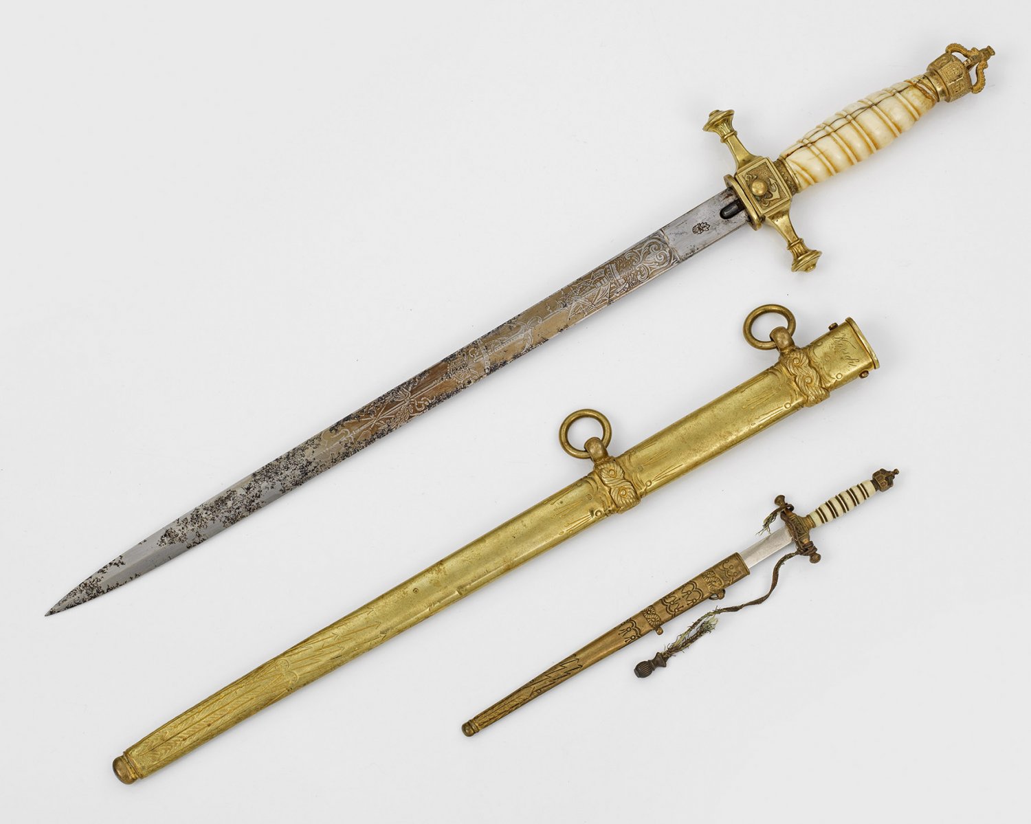 Auf zweischneidiger Eisenklinge beidseitig geätzter Marinedekor, minim. korrodiert. Parierstange mit Ankerdarstellung und Knauf in Form einer Kaiserkrone aus vergoldetem Messing. Elfenbeingriff besch.; Herstellerzeichen. Vergoldete Messingscheide mit Ringbändern in Form von Tampen, bez. Korsch. Korrespondierender Miniaturdolch mit glatter Klinge, Messingscheide und besch. Portepee. L. 17,5 cm - 47 cm.