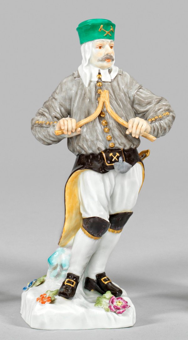 Auf einem mit Blumen belegten Felssockel stehender Obersteiger in berufstypischer Kleidung, in beiden Händen eine Wünschelrute haltend. Polychrome Malerei mit Gold. Entw. Johann Joachim Kaendler und Peter Reinicke. Modell-Nr. 69511. Minim. rest.; Schwertermarke. H. 20,5 cm.
