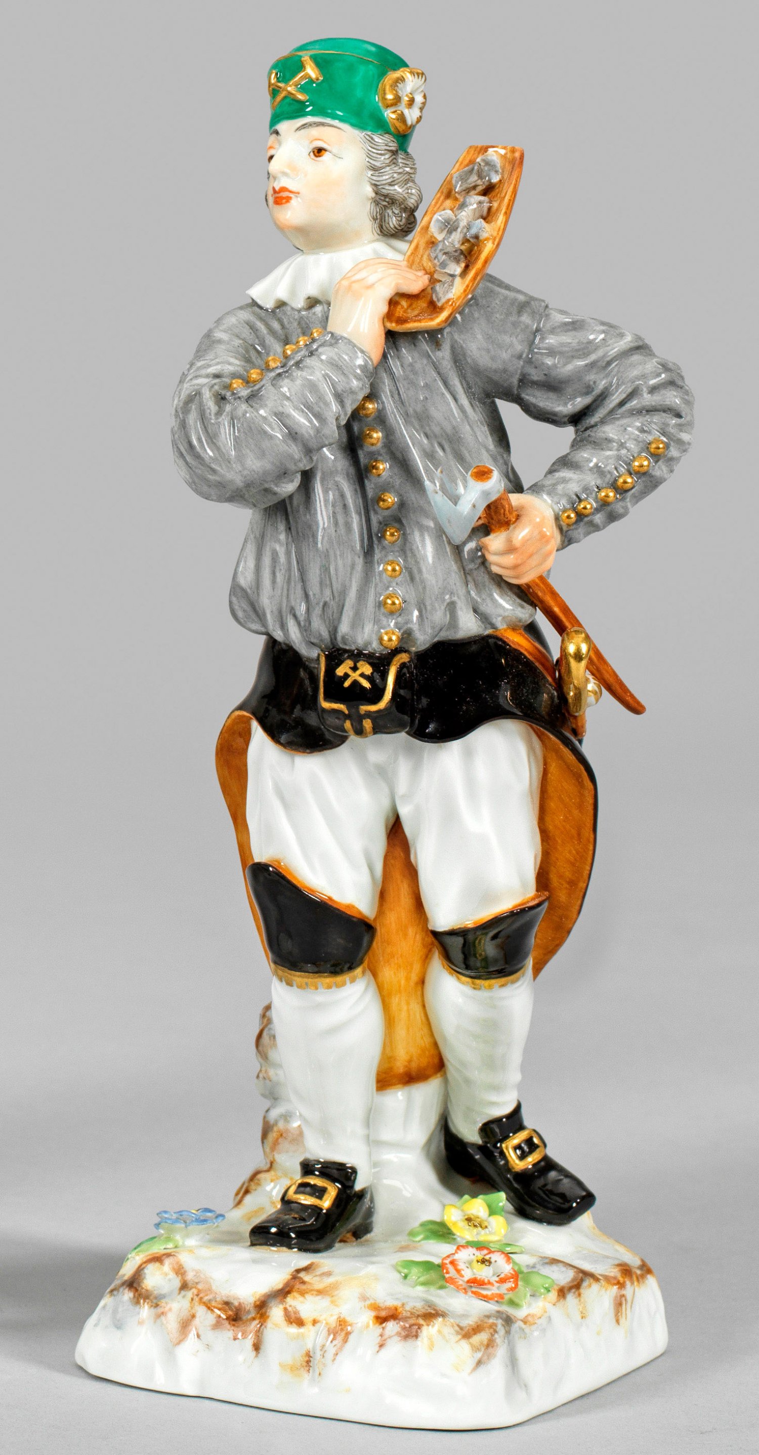 Auf einem mit Blumen belegten Felssockel stehender Bergmann in berufstypischer Kleidung mit grüner Kappe und Bergmannsemblem. In der linken Hand einen Häckel, auf der linken Schulter eine Mulde tragend. Polychrome Malerei mit Gold. Entw. Johann Joachim Kaendler und Peter Reinicke. Modell-Nr. 69511. Minim. rest.; Schwertermarke. H. 21,5 cm.