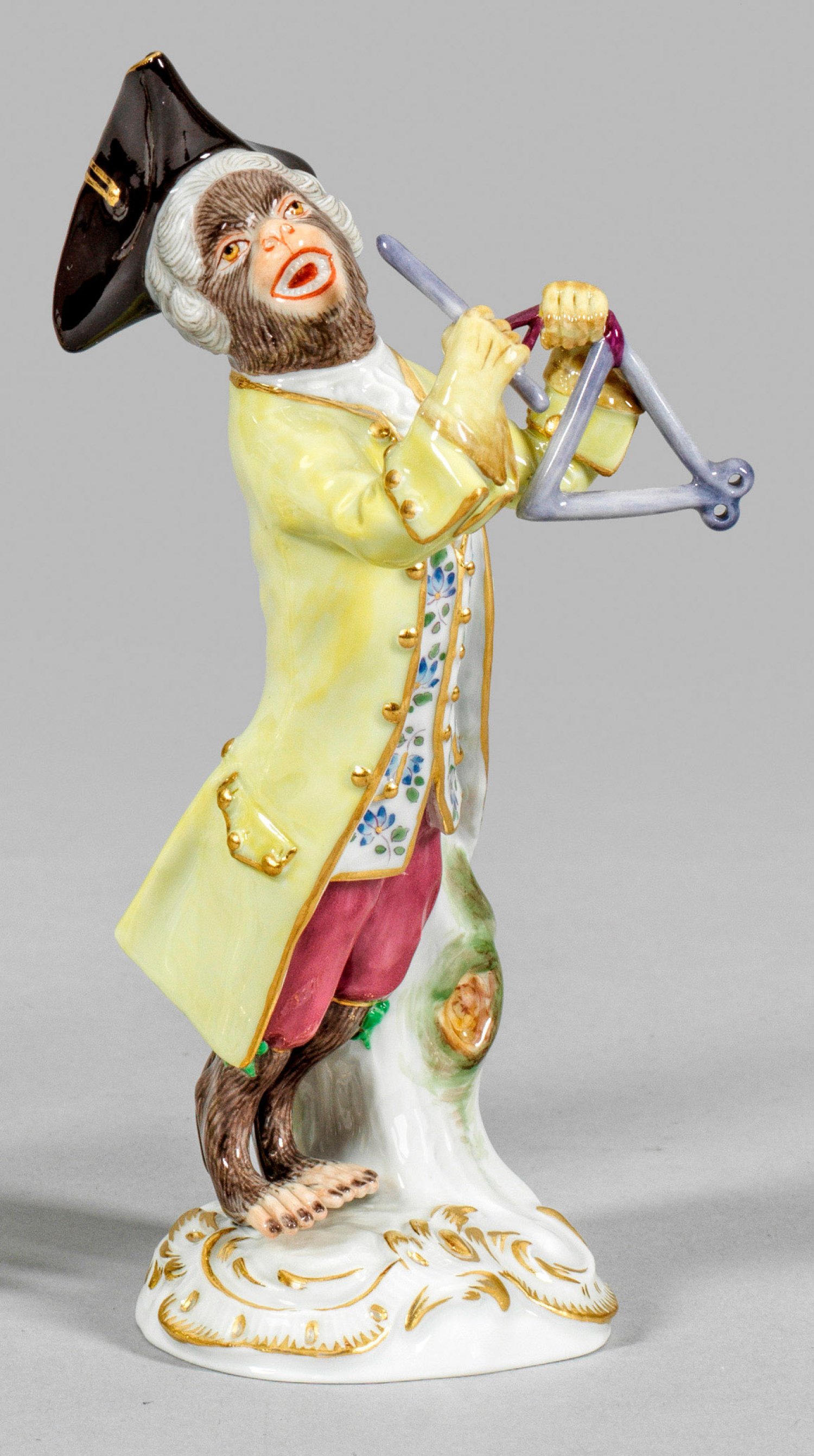 Auf rocaillereliefiertem Sockel stehender Affe als Musikant mit Triangel. Polychrome Malerei mit Goldstaffage. Entw. Johann Joachim Kaendler und Peter Reinicke. Modell-Nr. 60013. Schwertermarke. H. 14,5 cm.