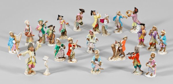 A complete 22-piece collection of porcelain figures from the "monkey orchestra" modelled by J. J. Kaendler and P. Reinicke. Desk dated after 2000. Partly minor chipped/restored. Crossed swords mark.
