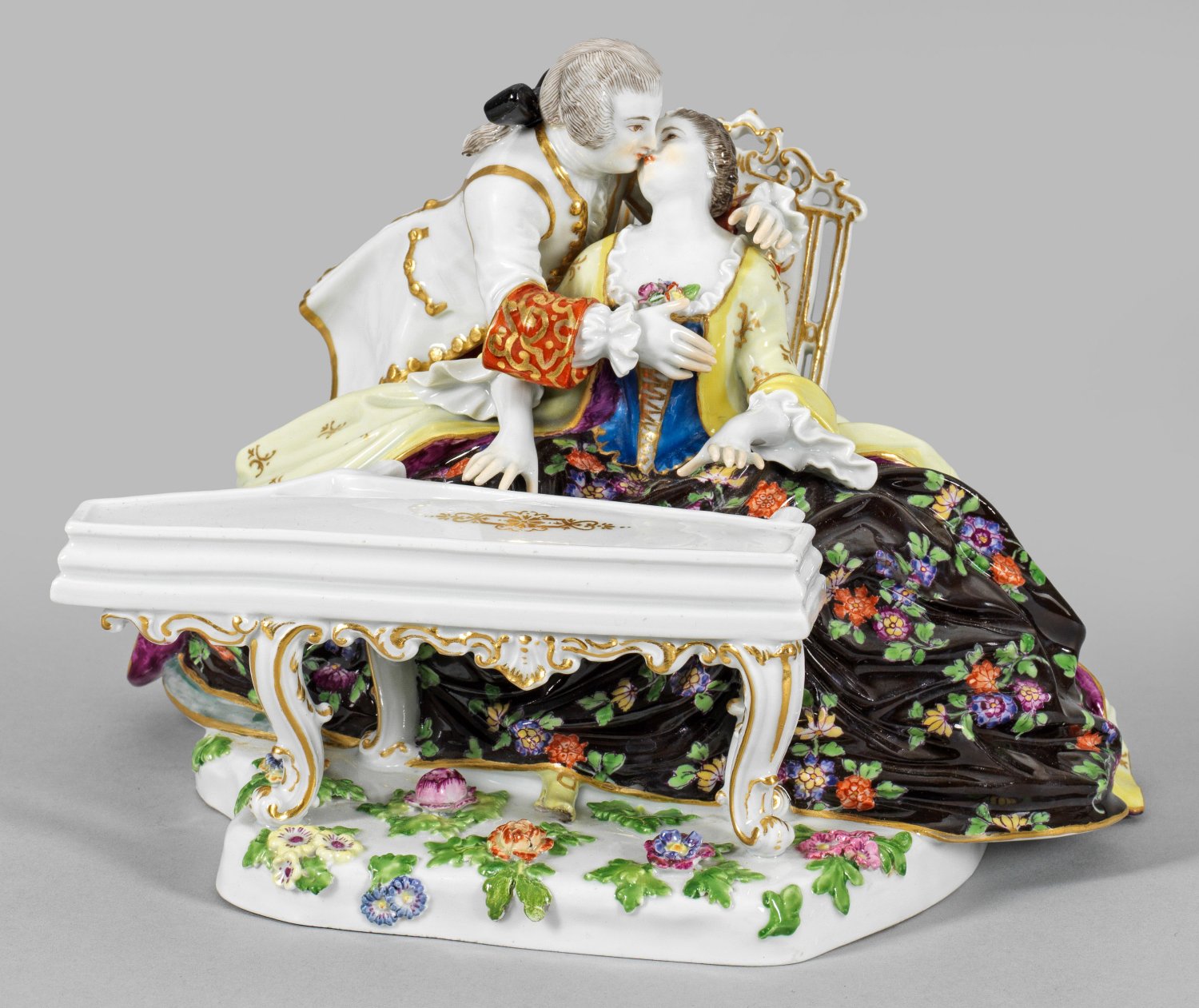 Unregelmäßiger, mit plastischen Blüten und Blättern belegter Sockel. An einem Spinett sitzende, spielende Edeldame mit weitem, braunem, von großen Indianischen Blumen gemusterten Krinolinenrock, einem blauen Mieder und gelbem Mantel mit Golddekor. Seitlich der elegant in weißem, gold gesäumtem Gehrock gekleidete Kavalier, seine Geliebte umarmend und küssend. Polychrome Malerei mit reicher Goldstaffage. Entw. Johann Joachim Kaendler. Modell-Nr. 186 x. Unw. rest.; Schwertermarke. H. 16,5 cm.