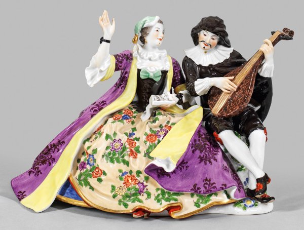 Auf einem Baumstumpf sitzender, die Laute spielender Scaramuz in schwarzem Kostüm mit weißem Kragen. Seitlich sitzende junge Dame im festlichen Gewand mit chamoisfarbenem Reifrock mit Indianischen Blumen, schwarzem Mieder und purpurfarbenem, floral gemustertem Mantel, in der linken Hand ein Notenblatt haltend. Polychrome Malerei mit Goldstaffage. Entw. Johann Joachim Kaendler. Modell-Nr. 250. Schwertermarke. H. 18,5 cm.