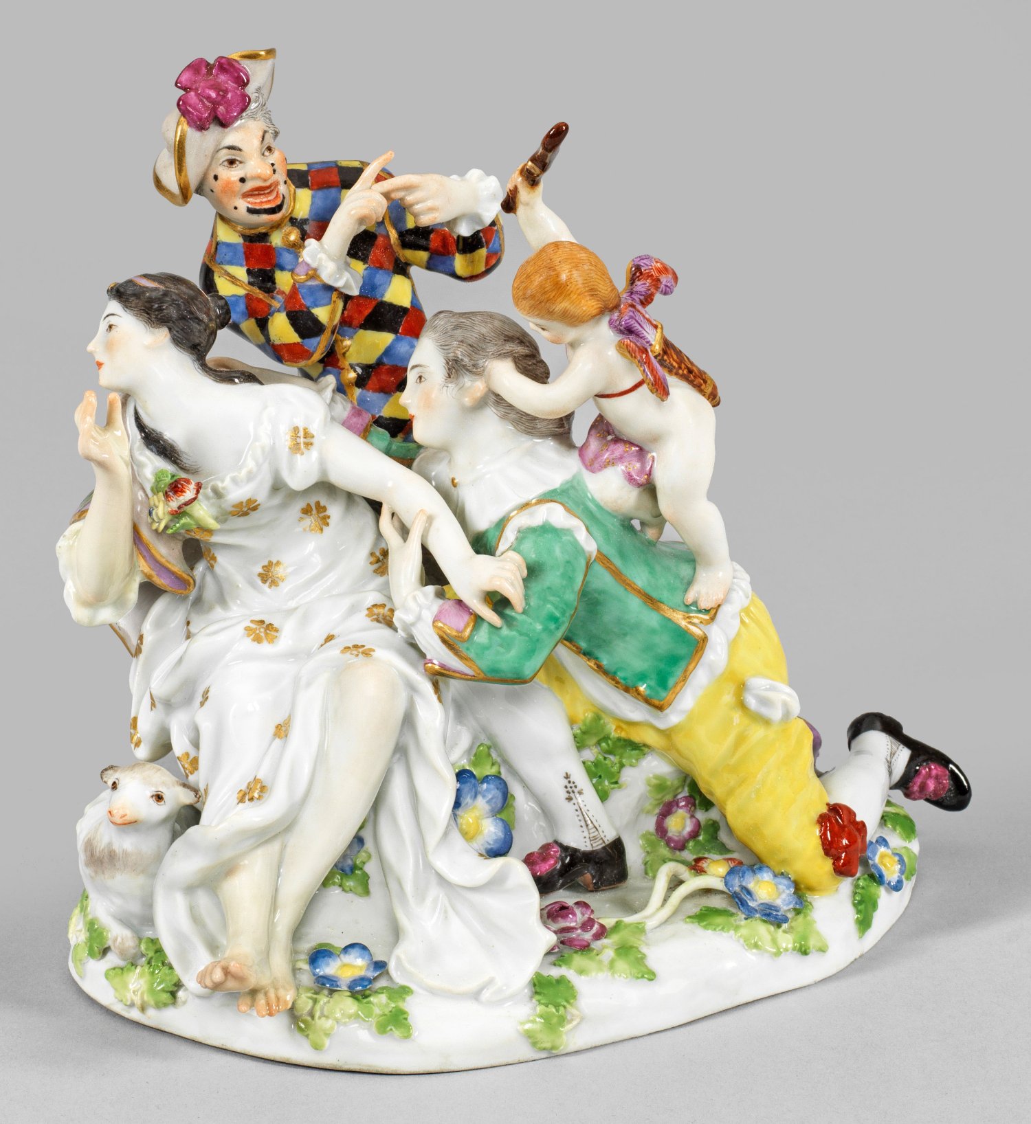 Auf flachem, blüten- und blattbelegtem Sockel vollplastische, szenische Darstellung eines knienden Kavaliers in gelber Kniebundhose und seegrüner Jacke mit weißem Kragen, die neben ihm sitzende junge Schäferin in weißem, goldgeblümtem Gewand umwerbend, während sich diese abwendet. Auf seinem Rücken der kleine Amor, in der erhobenen rechten Hand einen Bogen als Knüppel haltend. Mit der Linken an den Haaren des Kavaliers ziehend. Rückseitig stehender Harlekin in farbenfrohem, rautengemustertem Kostüm mit Hut, sich mit einer Spottgeste über die Szenerie belustigend. Polychrome Malerei mit Goldstaffage. Entw. Johann Joachim Kaendler. Modell-Nr. 464. Unw. rest.; Schwertermarke. H. 17 cm.