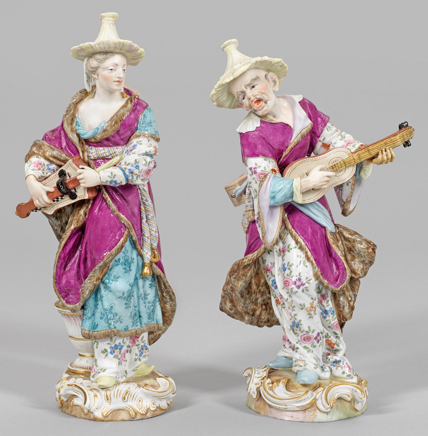 Gegenstücke. Auf stark reliefiertem Rocaillesockel stehende, die Drehleier spielende Malabarin bzw. die Gitarre spielender Malabar in langem, mit Indianischen Blumen gemustertem Gewand und pelzgefüttertem Mantel sowie mit spitzem Strohhut, auf dem Rücken eine Laterne bzw. ein Holzkästchen tragend. Polychrome Malerei mit Goldstaffage. Entw. Friedrich Elias Meyer. Modell-Nr. 1519 un 1523. Rest.; Schwertermarke. H. 31 cm - 33 cm.