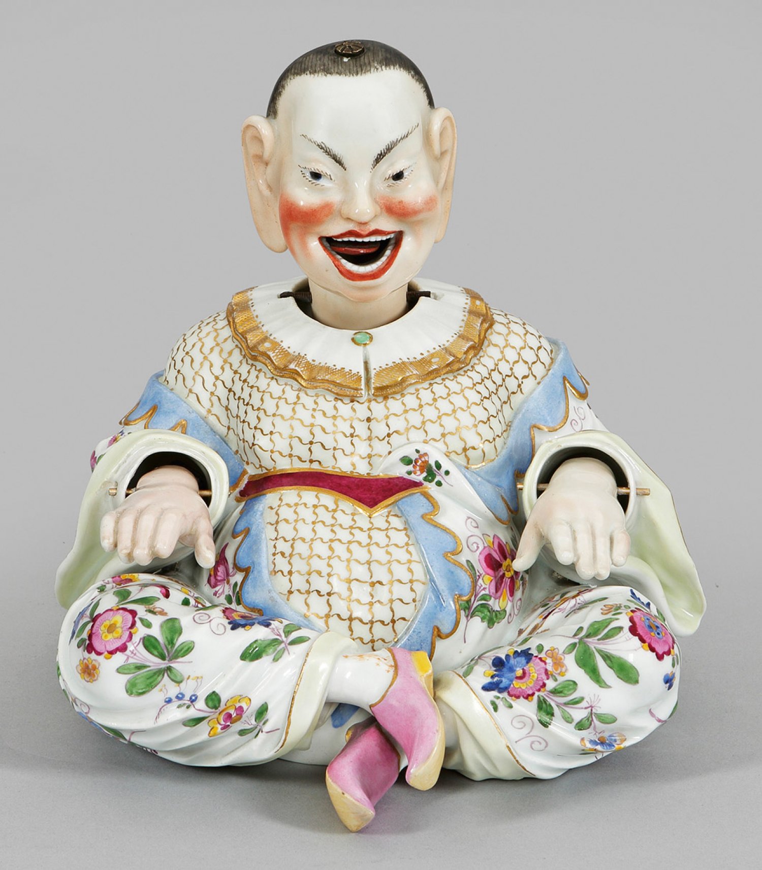 Mit verschränkten Beinen sitzender, dickbäuchiger Chinese in einem weißen, von großen Indianischen Blüten gemusterten Gewand mit hellblauem Innenfutter, purpurfarbenem Gürtel, spitzengesäumtem, weißem Kragen sowie rosafarbenen Pantoffeln. Der halbnackte Oberkörper von einem Goldnetz bedeckt. Hände, Kopf und Zunge beweglich. Polychrome Malerei mit Goldstaffage. Entw. Johann Joachim Kaendler. Minim. rest./produktionsbedingte Brandrisse. Schwertermarke. H. 18 cm.