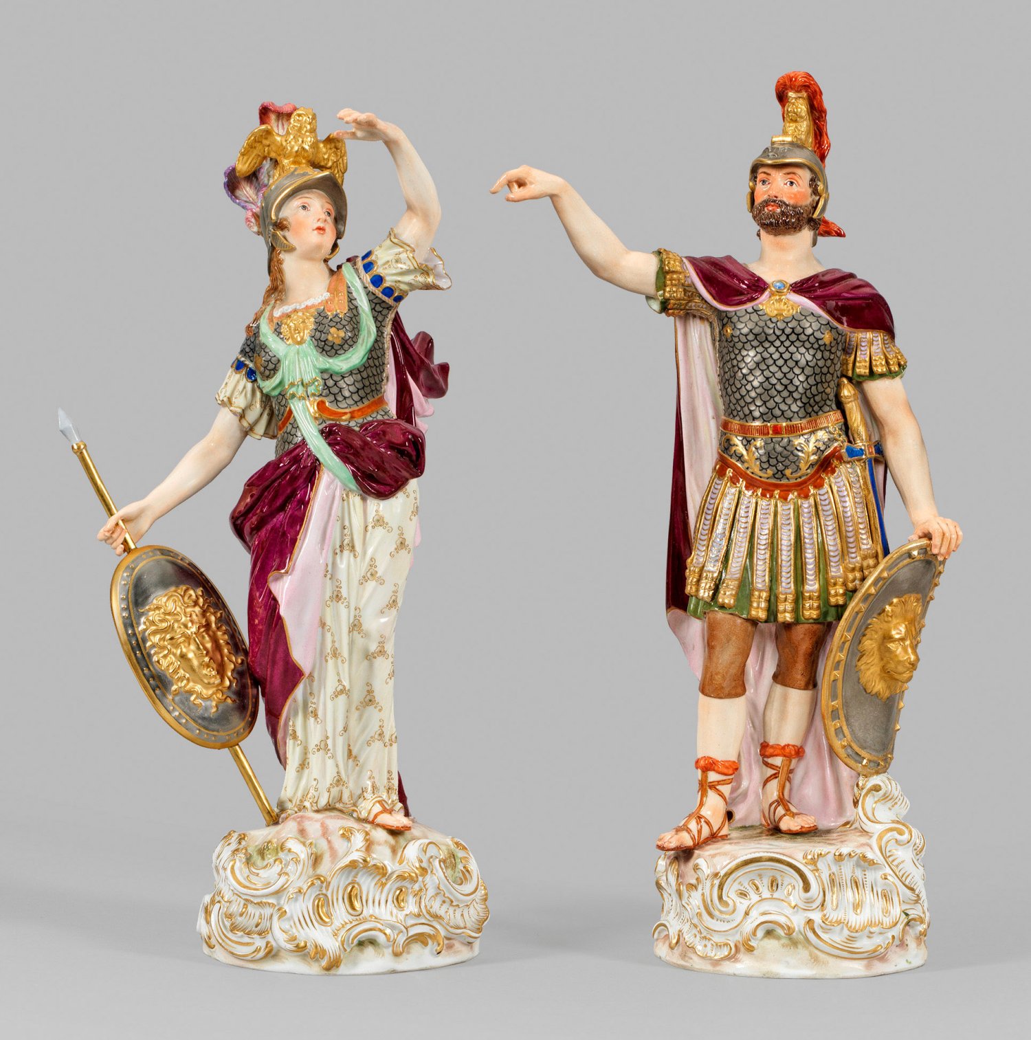 Gegenstücke. Auf hohem, von stark reliefplastischen Rocaillen umzogenem Sockel im Kontrapost stehender Mars, Gott des Krieges, in majestätisch-stolzer Haltung in Kriegsgewandung eines römischen Feldherrn aus silbernem Schuppenpanzer über Panzerunterkleid und olivgrüner Tunika, die Schultern bedeckt von einem purpurfarbenen Feldherrenmantel. Auf dem Kopf einen silbernen Helm mit Löwenfigur als sein Attribut mit feuerrotem Helmbusch tragend. Seitlich das gegürtete Schwert. Seine rechte Hand hat er mit Zeigegestus erhoben, die Linke stützt er auf einen am Boden abgesetzten Schild mit Löwenkopf. Als Gegenstück Minerva, die römische Göttin der Weisheit und klugen Kriegsführung in selbstbewusster Pose, gekleidet in einen Brustpanzer mit Medusenhaupt über langem, von Goldblüten gemustertem Gewand sowie purpurfarbenem Mantel. Ihr Helm bekrönt von ihrem Attribut, der Eule, mit Federbusch. Ihr linker Arm ist erhoben, die Rechte trägt einen Speer mit Medusenschild. Polychrome Malerei mit reicher Goldstaffage und feinen Goldradierungen. Entw. Michel Victor Acier, 1778/1779. Modell-Nr. F 29 und F 30. Minim. rest.; Schwertermarke. Meissen. 2. Hälfte 19. Jh.; H. 35,5 cm - 37 cm.
