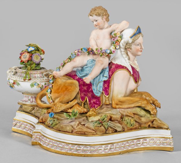 Frontseitig passig geschweifter Sockel mit reliefiertem Profil- und Flechtband. Über gehöhtem, felsigem Terrain mit aufgelegten Blüten und Blättern liegende Sphinx mit Löwenkörper und weiblichem Kopf, bekrönt von einem Nemes-Kopftuch mit Diadem. Auf ihrem Rücken ein edler, purpurfarbener, von Golddekor und -quasten gezierter Überwurf, darauf sitzender, nackter Knabe mit hellblauem Lendentuch und fein modellierter Blumengirlande. Seitlich stehende, prunkvolle, klassizistische Widderkopf-Jardiniere mit plastischem Blumenbukett. Polychrome Malerei mit reicher Goldstaffage. Entw. Michel Victor Acier, um 1772/74. Modell-Nr. 18. Unw. rest.; Schwertermarke. H. 23 cm.