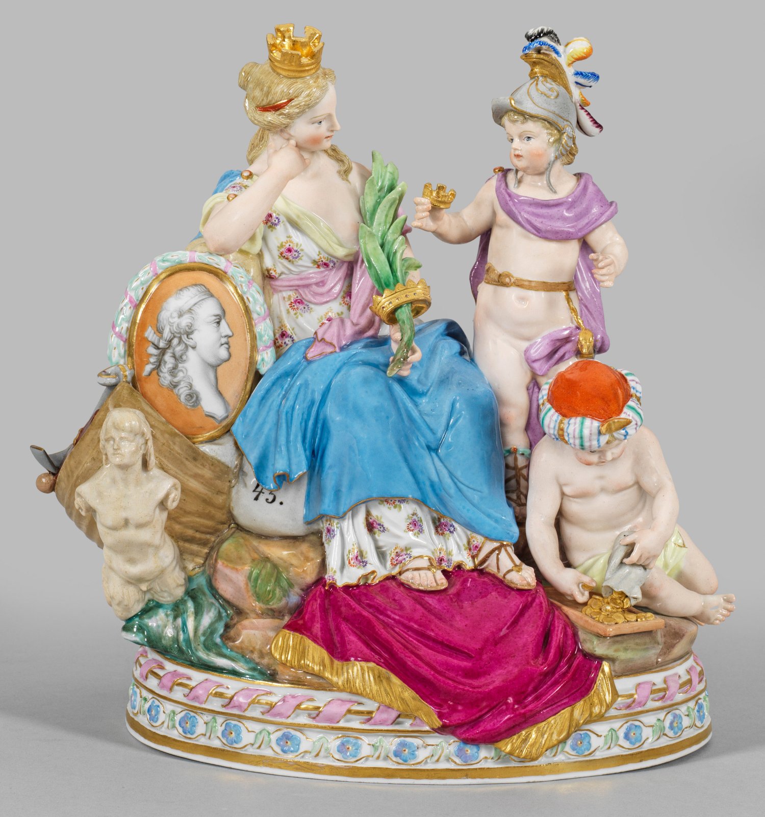 Ovaler Felssockel mit reliefierten Ornamentbordüren. Auf felsiger Anhöhe sitzende Göttin Cybele mit goldener Mauerkrone in antikisierendem Gewand und blauem Himation, ihren rechten Ellenbogen auf einem Stapel von geschnürten Warenballen stützend, in der linken Hand einen Palmzweig mit edelsteinbesetzter Krone haltend. Die Ballen bezeichnet mit verschiedenen Bildsymbolen. Zu ihrer rechten Seite angedeuteter, plastisch aufgelegter Schiffsrumpf mit Galionsfigur und Anker sowie Ruder, Tau und Warenfässer, zudem ein aufgestelltes, von Lorbeerfestons geschmücktes Schild mit Bildnis von Zarin Katharina II.; Die Göttin blickt zu dem links stehenden Knaben mit federbekröntem Helm, Mauerkrone und gegürtetem Dolch. Am Boden ein weiterer, sitzender Knabe mit Turban, auf einem Zahlbrett Taler zählend. Polychrome Malerei mit reicher Goldstaffage. Entw. Michel Victor Acier, 1774. Modell-Nr. 20. Unw. rest.; Schwertermarke. H. 24 cm.