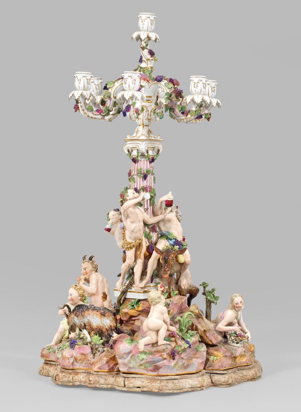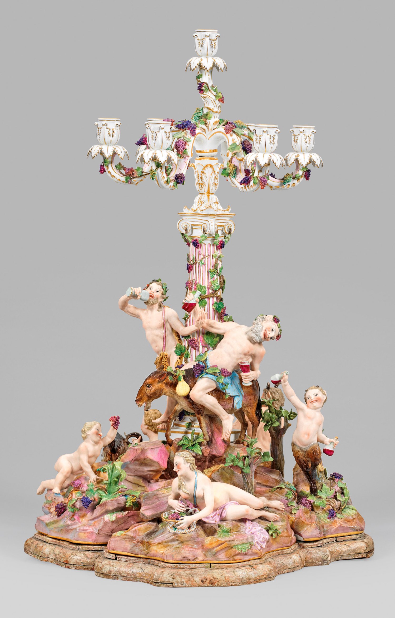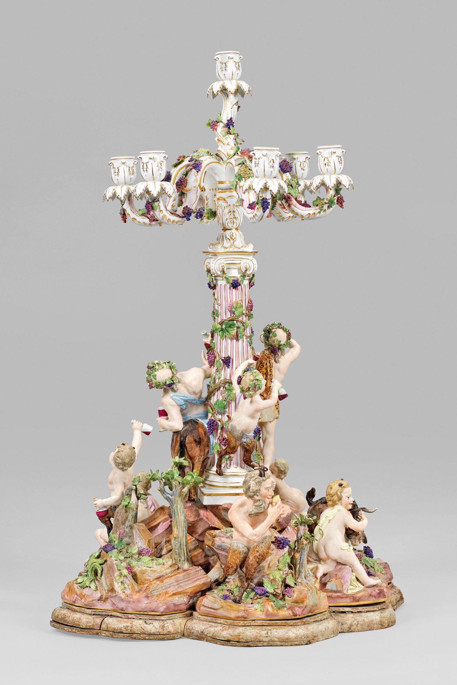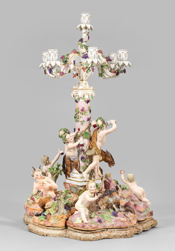 1- bzw. 7-flg.; Sechsteiliges, rundansichtig konzipiertes Ensemble aus vollplastischen Figuren bzw. -gruppen, montiert auf blassfarbig marmoriertem und profiliertem Holzsockel. Umlaufend dynamisch-bewegte, bacchanalische Szene, den ausgelassen feiernden Bacchus und sein trinkfreudiges Gefolge zeigend. Auf reliefplastischem, ansteigendem Felssockel mit aufgelegten Pflanzenbüscheln, kleinen Bäumen sowie Weinreben und -ranken mittig emporragender, ionischer Säulenschaft mit rosafarben staffierter Kannelierung, bekrönt von einer akanthusreliefierten Kerzentülle. Abnehmbarer Leuchteraufsatz aus sieben geschweiften Armen mit vasenförmiger Tülle über blattförmiger Rosette als Wachsfänger. Allseitig belegt von plastischen Weinlaubranken. Schauseitig auf einem Esel erhöht sitzender, trunkender Silen mit Weinflasche und -pokal, umgeben von dem weinbekränzten Bacchus mit Leopardenfell, sich ein Tringefäß zum Mund führend bzw. einem Satyrknaben mit menschlichem Oberkörper und Bocksbeinen. Unterhalb liegende Bacchantin mit einem traubengefüllten Korb. Zu ihren Seiten ein Putto, einen Bund Trauben emporhaltend bzw. ein weiterer Satyrknabe, jeweils eine Weinflasche in der Hand tragend. Rückseitig zwischen üppigem Blattwerk und Weinreben hockende, gehörnte Amorette, einen sich wehrenden Ziegenbock an den Hörner packend. Zu seiner Rechten stehender, die Flöte spielender Pan. Polychrome Malerei mit Goldstaffage. Entw. Johann Joachim Kaendler, um 1766. Modell-Nr. A 196. Unw. rest.; Schwertermarke. Meissen. 2. Hälfte 19. Jh.; H. 56 cm bzw. 75 cm.