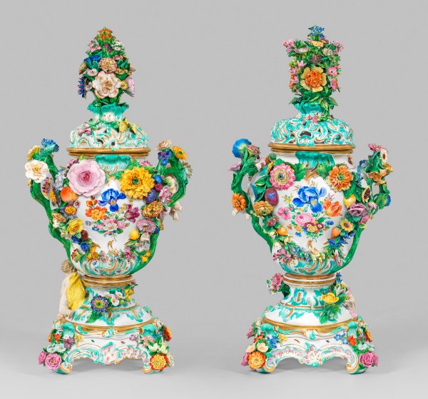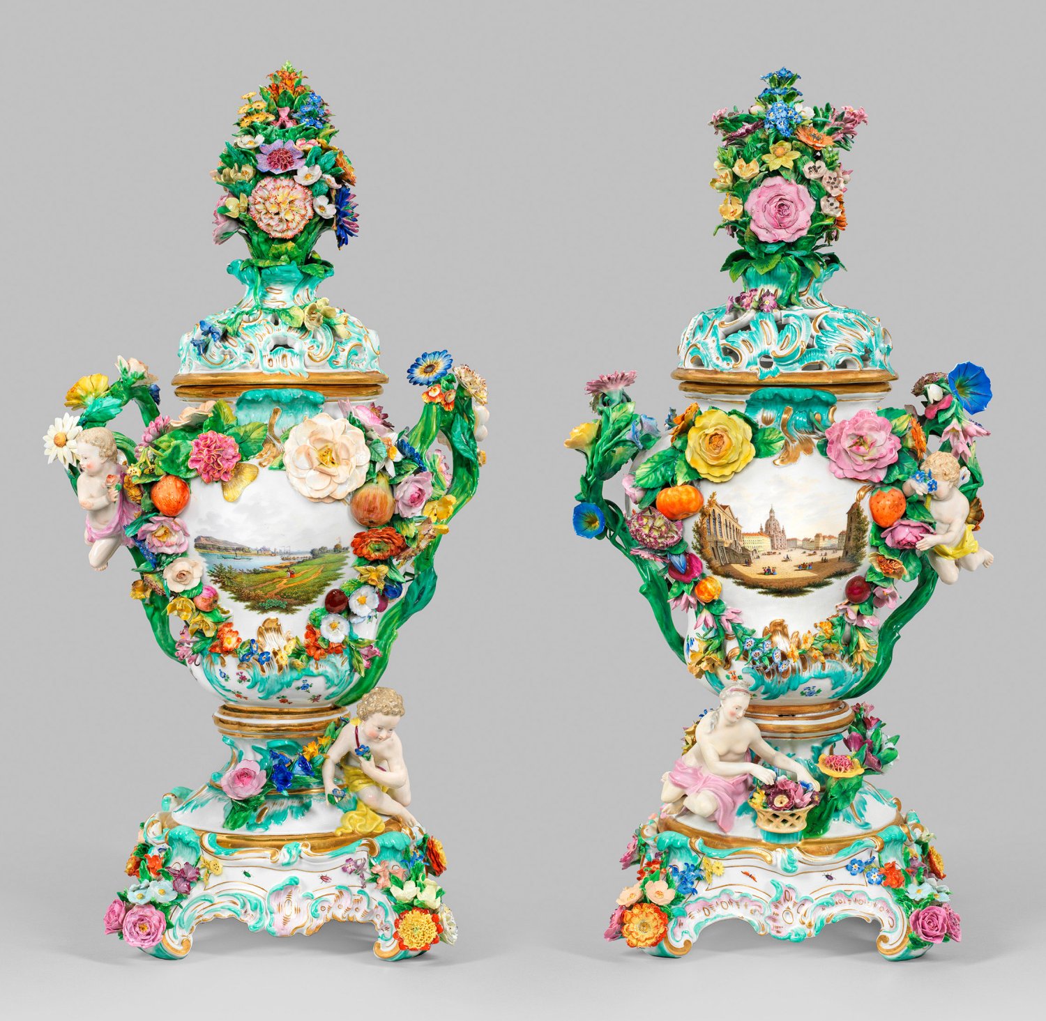 auf quadratischem, von eingerollten Volutenfüßen getragenem Sockel. Über getrepptem, rocaillereliefiertem Rundfuß balusterförmiger, stark vorwölbender Vasenkorpus mit gerundeter Schulter und profiliertem Rand. Gehöhter, von Rocaillereliefs umzogener, durchbrochen gearbeiteter Deckel, in reliefplastische Blätter übergehend, als Basis für ein prächtiges Blumenbukett aus verschiedenen, äußerst feinplastisch modellierten, geöffneten Blüten. Seitlich reliefplastisch aufsteigende Blumenranken als Handhaben. Feinplastisch modellierter, aufgelegter Dekor mit üppigen Festonen aus sommerlichen Blüten und Früchten. Unterhalb sitzende Flora bzw. Amorette mit gefülltem Blumenkorb und Girlande. Oberhalb jeweils schwebende Amorette. Beidseitig der Wandung zwischen farbigem Streublumendekor angelegte farbenfrohe Blumenarrangements sowie eine Ansicht des Dresdner Neumarktes mit Blick auf die Frauenkirche bzw. der Darstellung des Blickes über die Elbe auf Schloss Pillnitz. Feine polychrome Malerei mit reicher Goldstaffage. Entw. Johann Joachim Kaendler. Minim. best.; Rest.; Modell-Nr. 2745. Schwertermarke. Meissen, 19. Jh. Ges.-H. ca. 65 cm. Vasen-H. 37 cm.