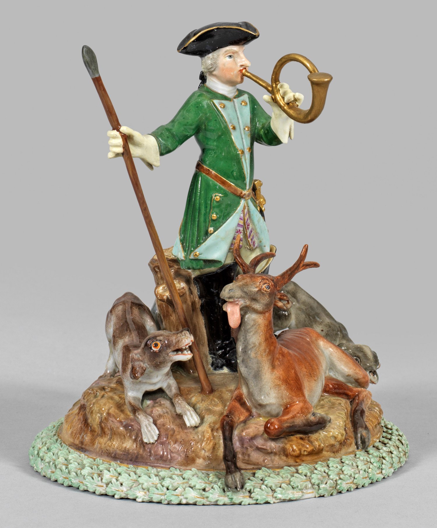 Auf rundem, von fein aufgelegten Eichenblättern umzogenenem Terrainsockel stehender Jäger mit goldenem Jagdhorn und Speer, umgeben von Hunden und einem erlegten Hirsch. Polychrome Malerei mit Goldstaffage. Entw. Johann Friedrich Eberlein. Modell-Nr. 216. Unw. rest.; Schwertermarke. H. 21,5 cm.